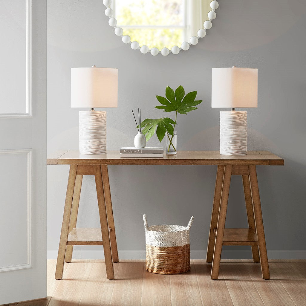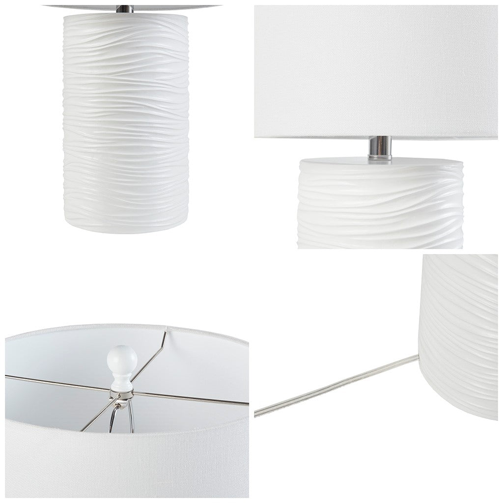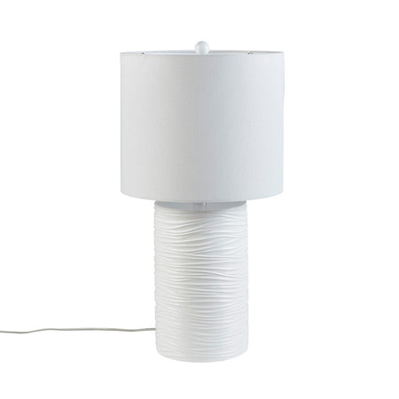 The 510 Design Crewe Textured Resin Table Lamp offers a clean and minimalistic update to your decor. Crafted from resin, this cylindrical lamp features a matte white finish with textured details for a chic modern look. The coordinating round drum shade softly filters the light to create a warm glow, while the 3-way rotary switch allows you to dim the light for the perfect ambience. Flaunting its unique design, this round table lamp provides an elevated accent piece as well as a practical light source that brings both fashion and function to any room in your home. Includes a 60" clear power cord and requires 1 Type A light bulb (not included). Spot clean only.