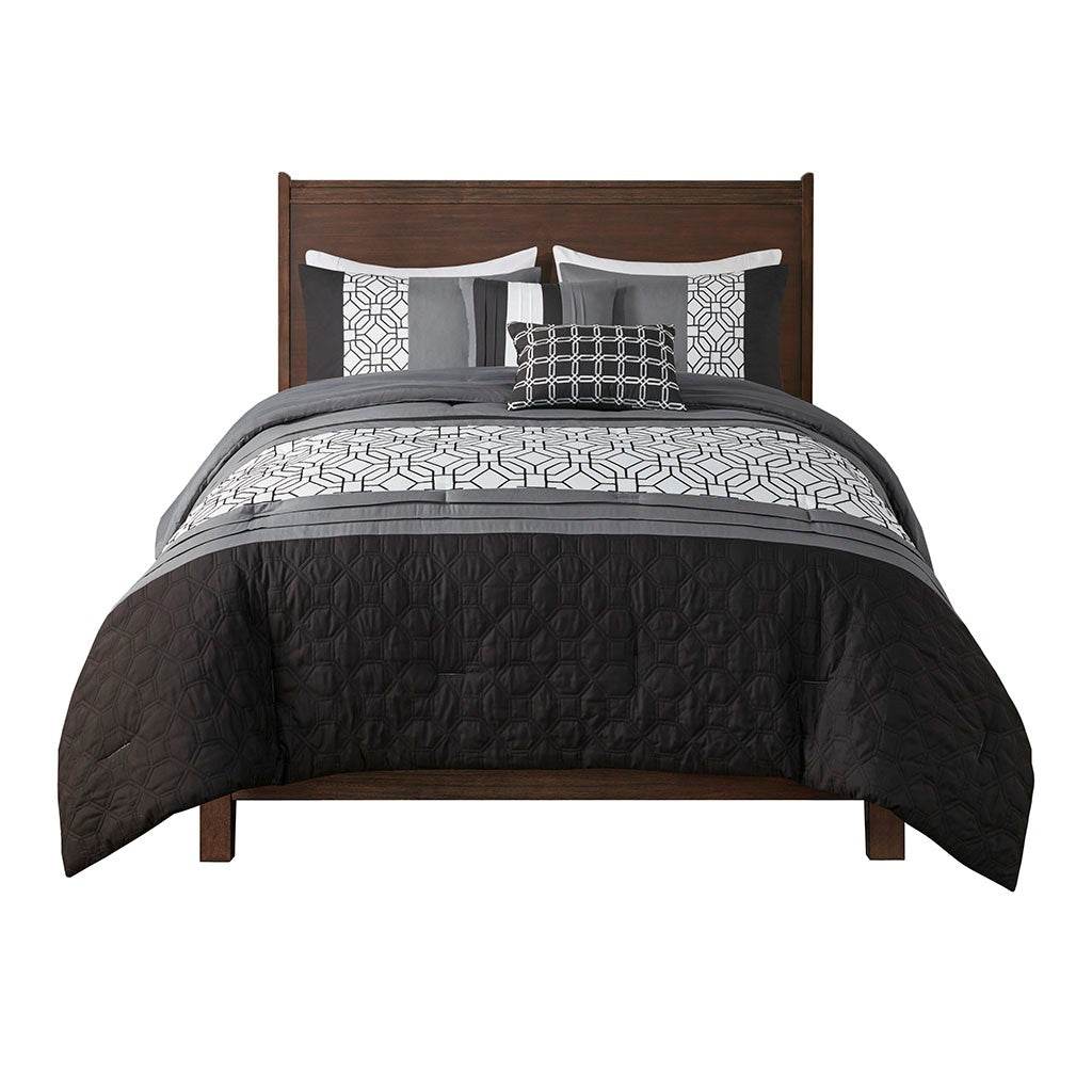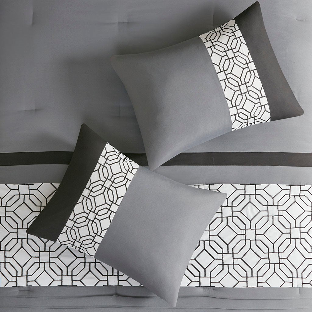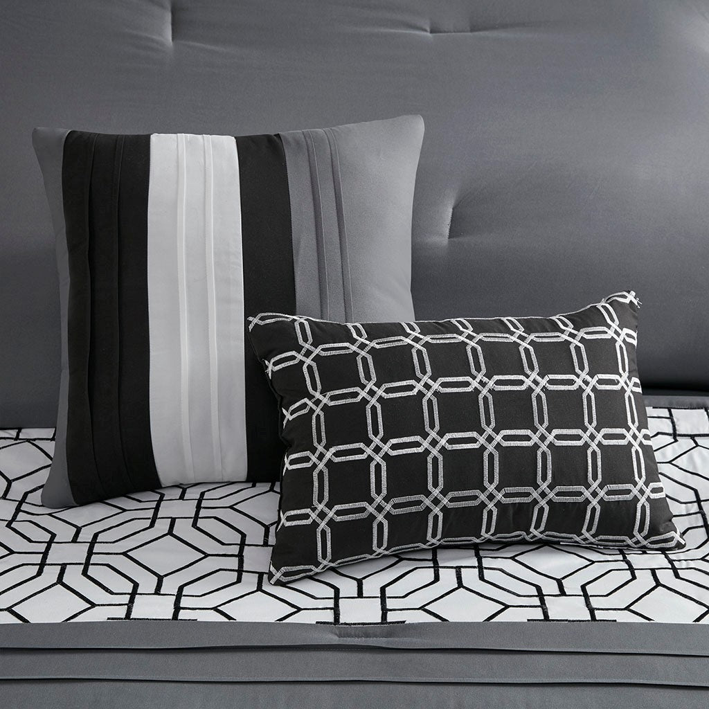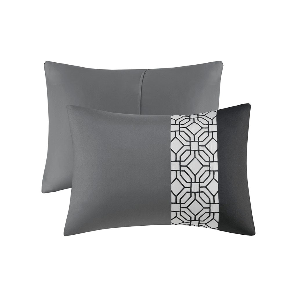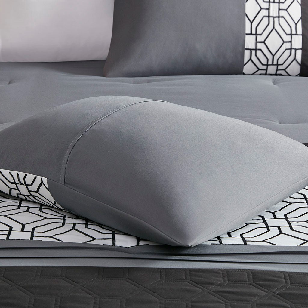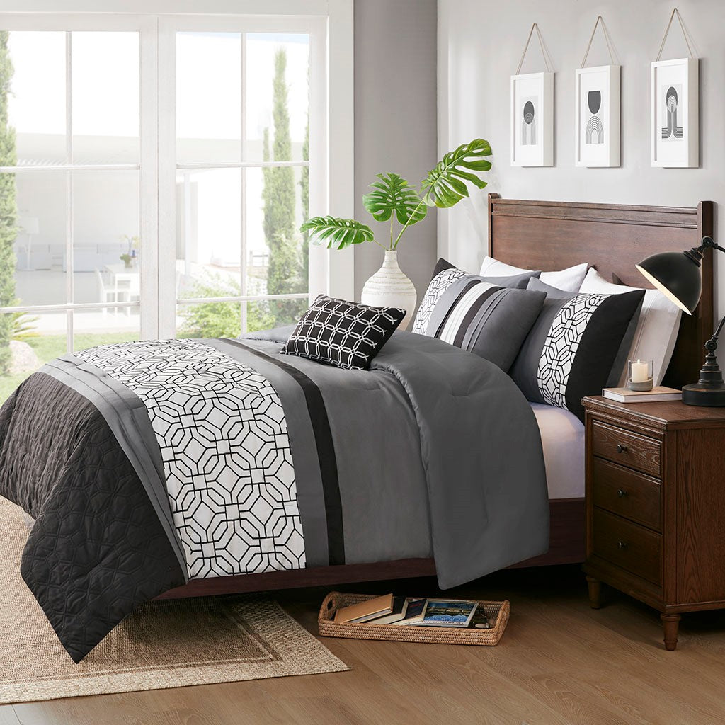 With charming style, the 510 Design Donnell Embroidered 5 Piece Comforter Set brings an eye-catching update to your bedroom. The ultra-soft microfiber comforter features a pieced design in grey, black, and white hues with a solid grey reverse. Detailed embroidery and a quilting design with pintuck details adorn the face of the comforter, adding texture and dimension to the top of the bed. Matching shams repeat the pieced design of the comforter for a chic coordinated look, while 2 decorative pillows with embroidered and pleated details provide the finishing touches to the casual bedding set. Machine washable for easy care, this transitional comforter set may come in rolled or compressed packing and will need to be fluffed up. Use a steam iron to help remove wrinkles easier.