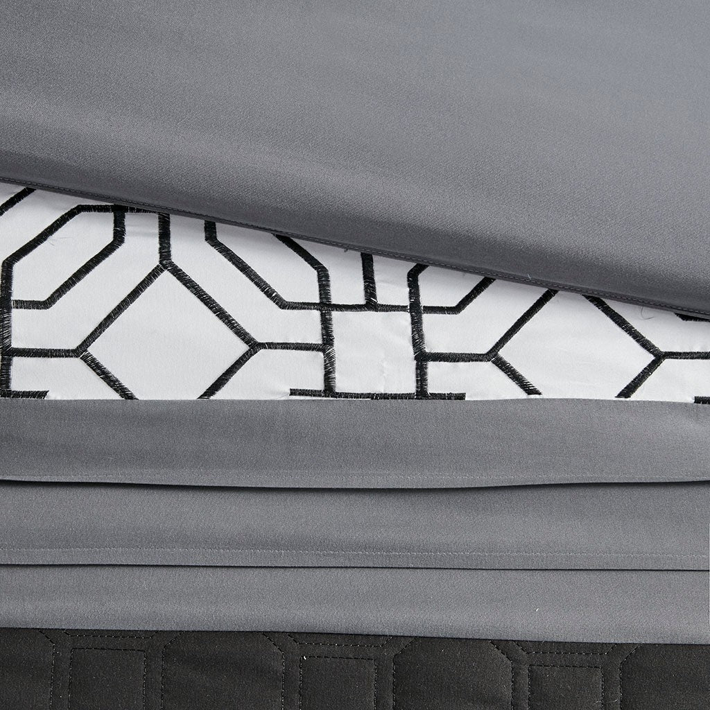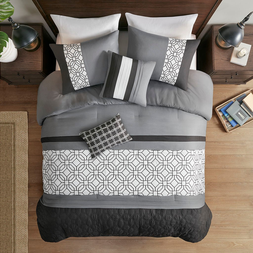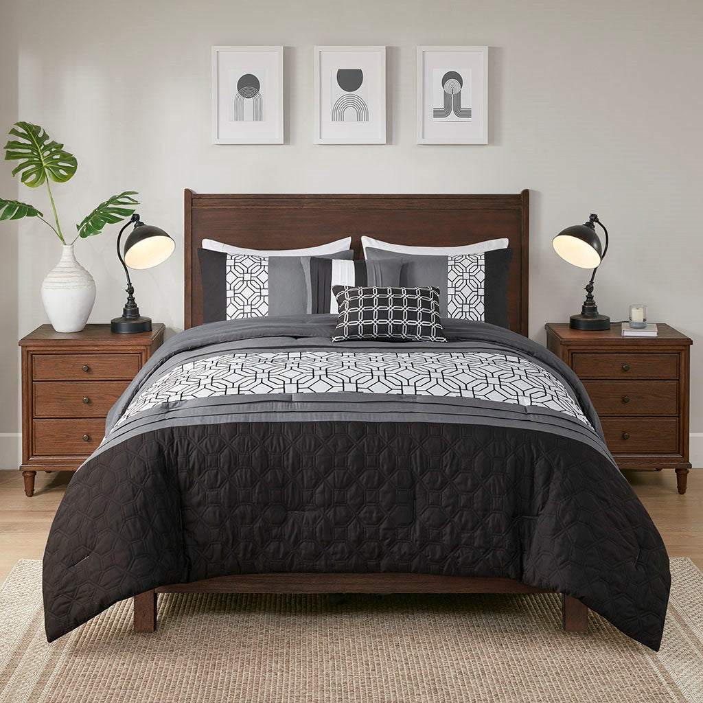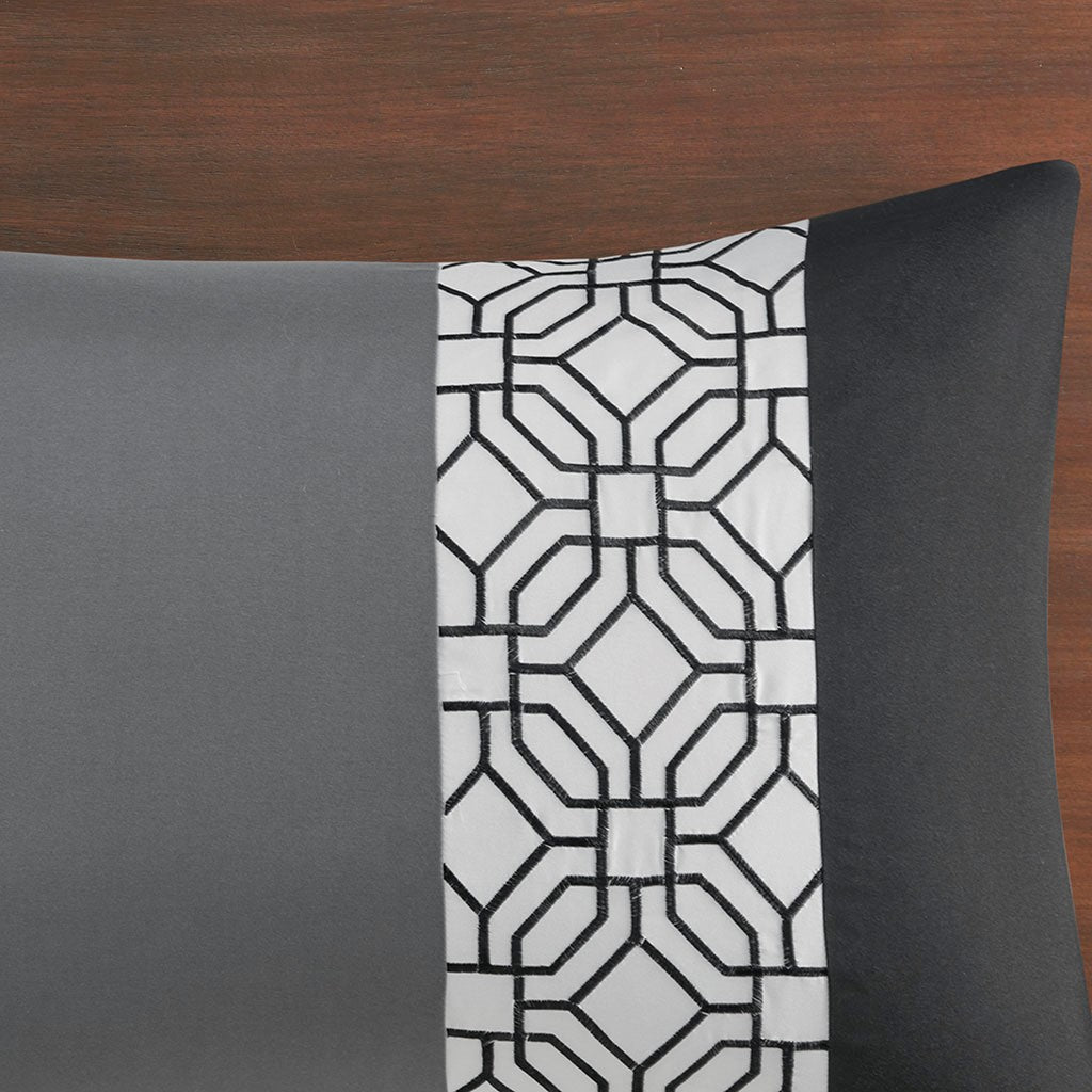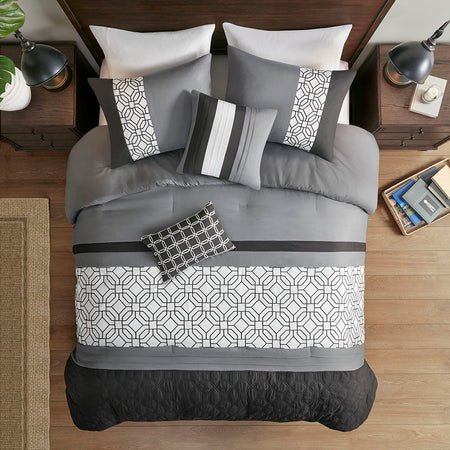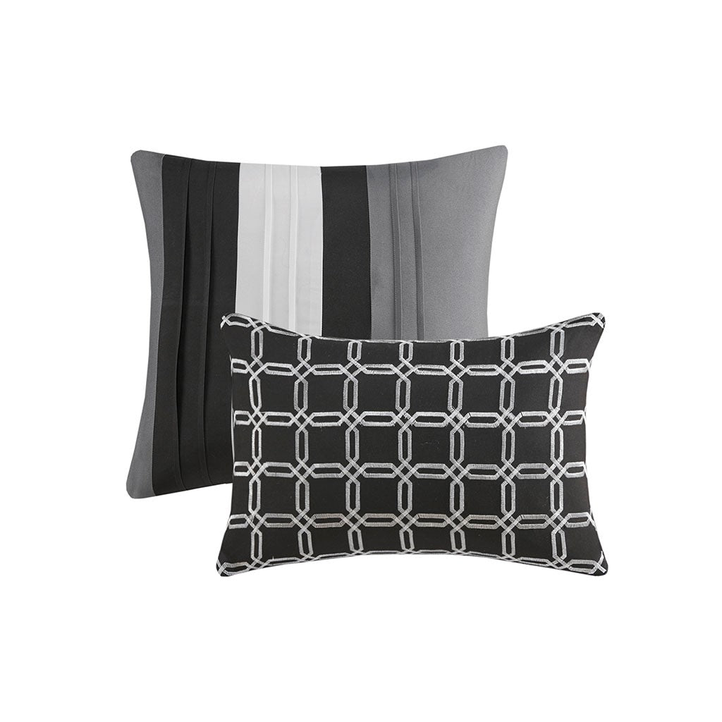 With charming style, the 510 Design Donnell Embroidered 5 Piece Comforter Set brings an eye-catching update to your bedroom. The ultra-soft microfiber comforter features a pieced design in grey, black, and white hues with a solid grey reverse. Detailed embroidery and a quilting design with pintuck details adorn the face of the comforter, adding texture and dimension to the top of the bed. Matching shams repeat the pieced design of the comforter for a chic coordinated look, while 2 decorative pillows with embroidered and pleated details provide the finishing touches to the casual bedding set. Machine washable for easy care, this transitional comforter set may come in rolled or compressed packing and will need to be fluffed up. Use a steam iron to help remove wrinkles easier.