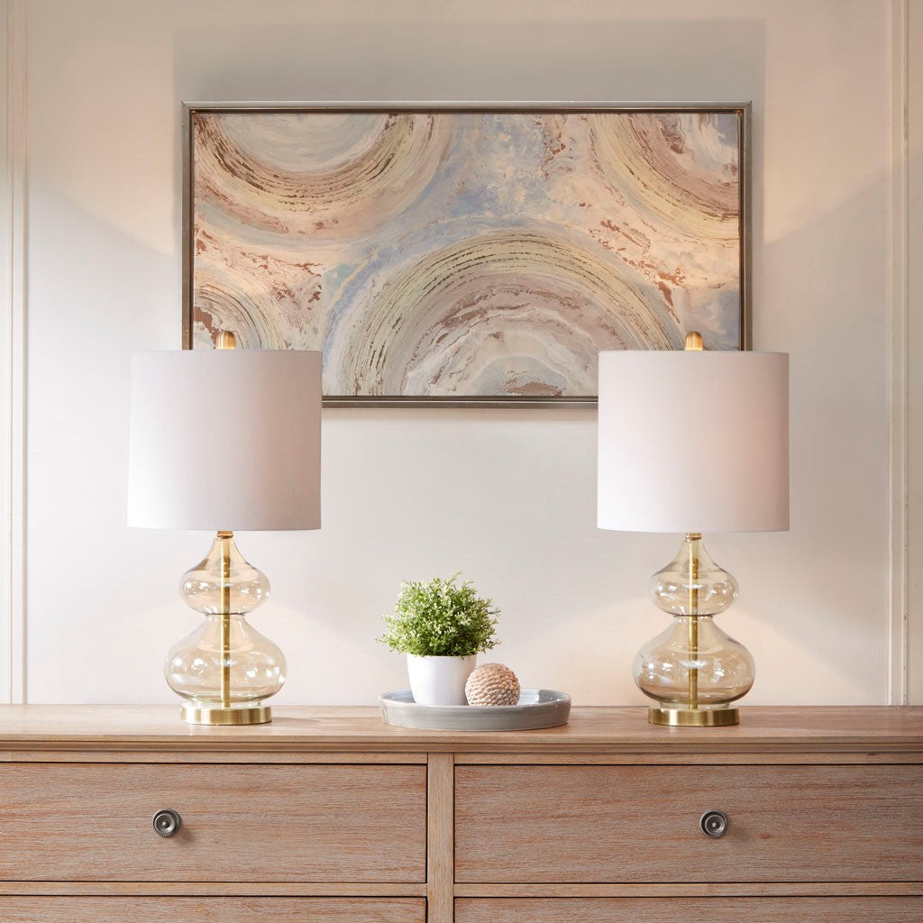 The Ellipse Curved Glass Table Lamp, Set of 2 provides a tasteful and charming touch to any space. The elegant curves of the gold glass base are complemented by a white drum-shaped shade, for a chic look. Accent your living room or add more light to your bedroom with the transitional appeal of this table lamp. One type A light bulb is needed. Comes with a 2-year warranty.