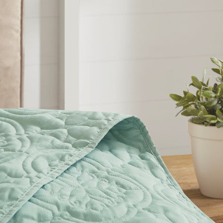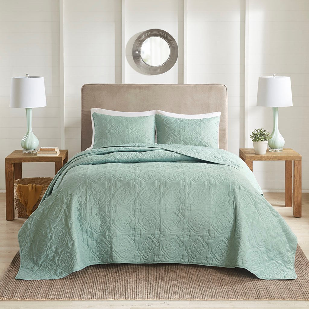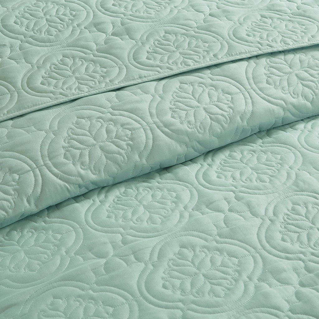 The 510 Design Oakley 3 Piece Reversible Bedspread Set offers a simple and stylish addition to your bedroom decor. A quilted medallion technique is displayed on the seafoam bedspread and shams, adding dimension and charm to the top of the bed. Unlike traditional coverlets or quilts, this bedspread is oversized to drape better and features 100% hypoallergenic polyester filling. Made from ultra-soft microfiber, this oversized cover up is machine washable for easy care and adds a chic transitional allure to your bedroom.