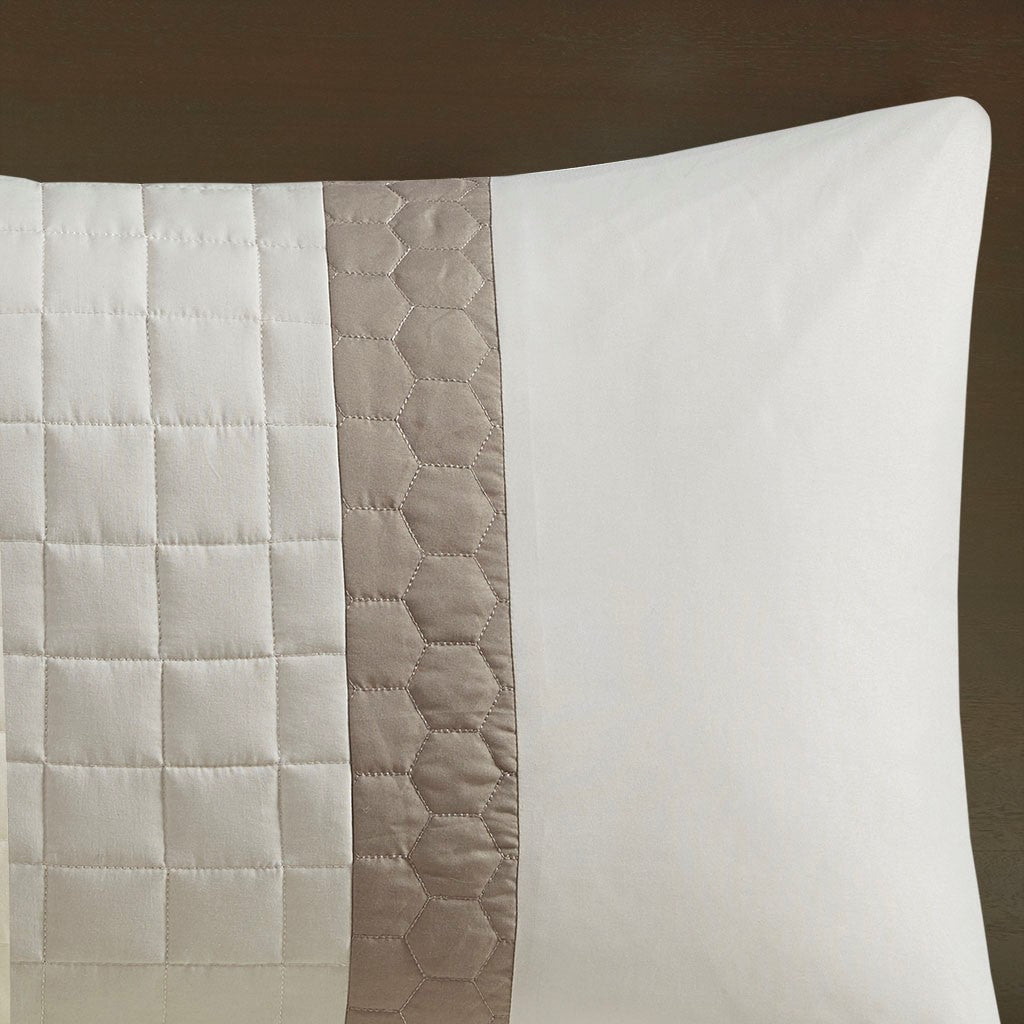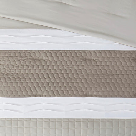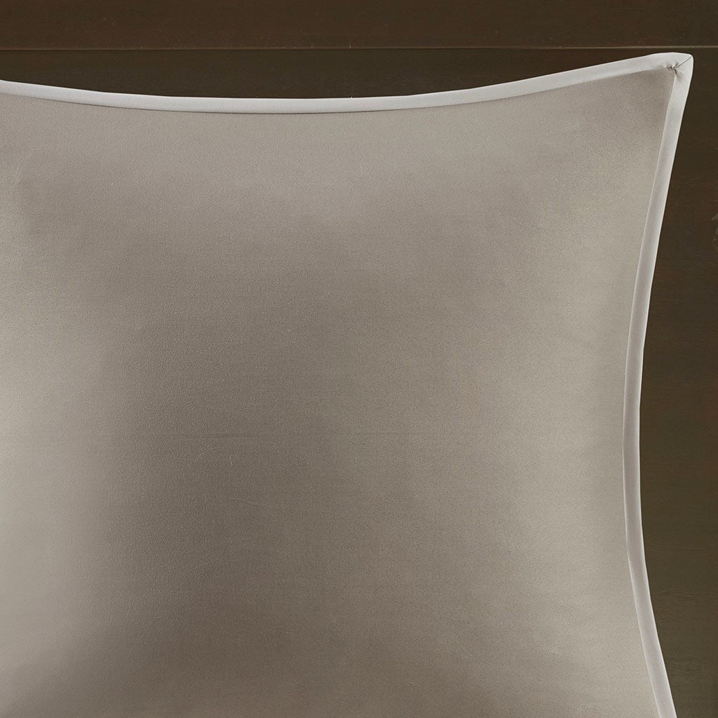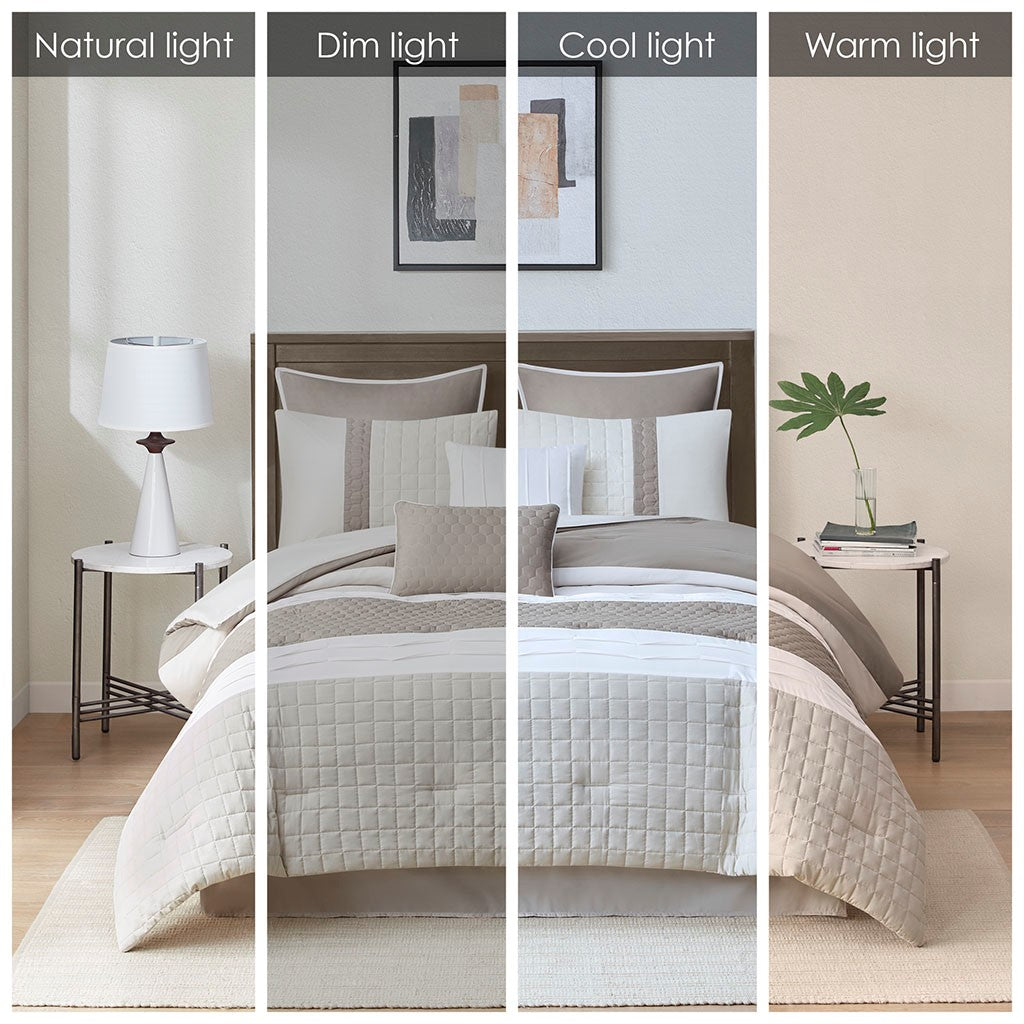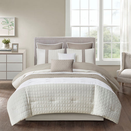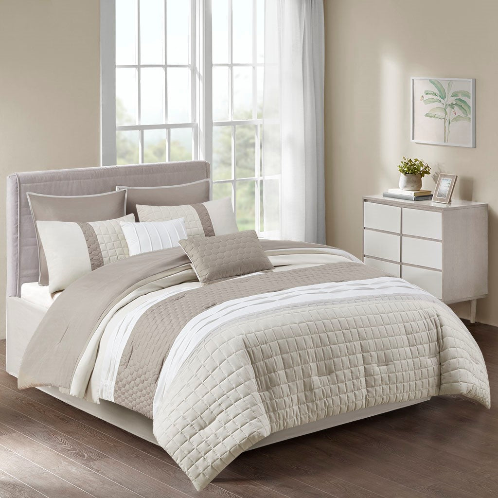 Add a warm and inviting new look to your bedroom with the 510 Design Tinsley 8 Piece Comforter Set. Made from ultra-soft microfiber, this comforter flaunts a pieced design with pleated accents that add dimension and charm. Quilting and pintuck details create a beautiful textural look and feel, while a solid reverse complements the top of the bed. The 2 coordinating shams reflect the design of the comforter and Euro shams with white flanges complete the chic ensemble. Also included are 2 decorative pillows and a solid bed skirt that provide the perfect finishes to the neutral bedding set. Machine washable for easy care, this quilted comforter set may come in rolled or compressed packing and will need to be fluffed up. Use a steam iron to help remove wrinkles easier.