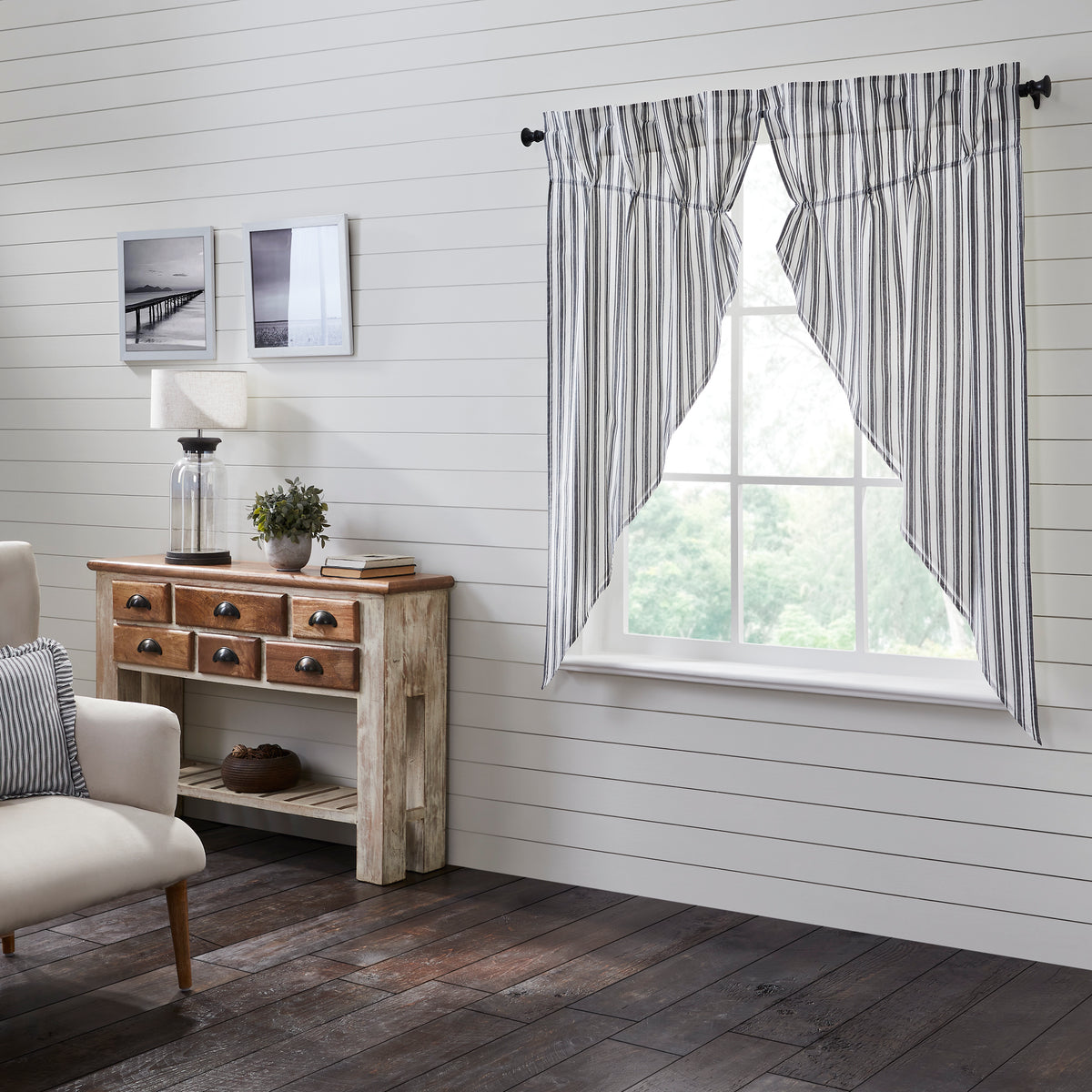 The Sawyer Mill Black Ticking Stripe Prairie Short Panel Set creates a relaxed country feel for your home. Featuring classic country black and soft white ticking stripes, these curtains are a versatile choice for accenting vintage kitchens, farmhouse laundry rooms, and more. The gracefully angled drapes perfectly frame windows providing a bit of polish for your home. Our fully lined prairie panels come with built in drawstrings to adjust each panel to meet your style needs, along with a curtain rod pocket for easy hanging.