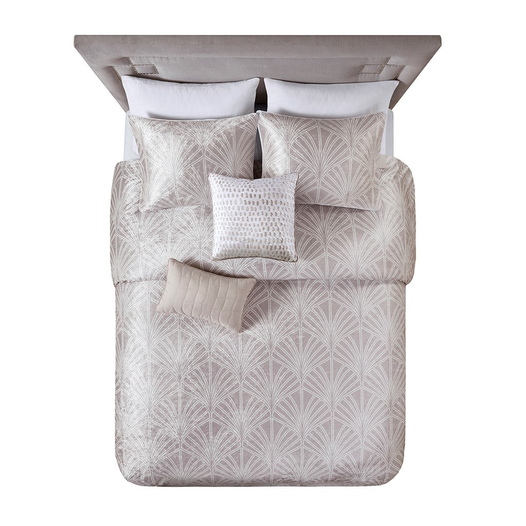 Give your bedroom a luxurious update with the Beautyrest Kiona 5 Piece Crushed Velvet Comforter Set. The oversized champagne crushed velvet comforter set features an art deco pattern for an elegant bedroom style. Embroidered abstract patterns in the square pillow and oblong pillow add the finishing touches to complete the look. Machine washable for easy care, this crushed velvet comforter set adds elegance to your bedroom and uses hypoallergenic filling to provide exceptional warmth and comfort.