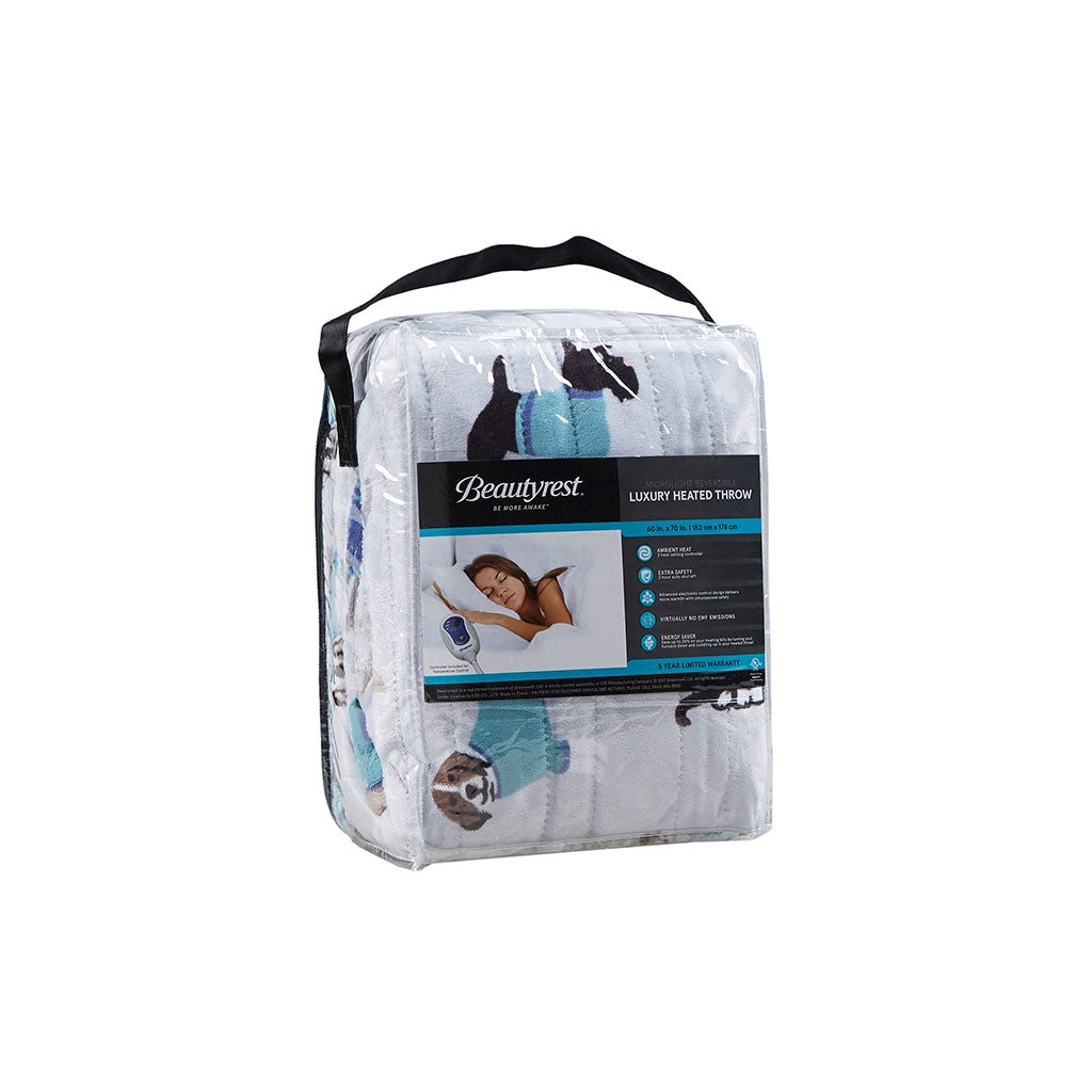 Wrap yourself up in the adorable comfort of the Beautyrest Oversized Plush Heated Throw. A cute dog printed motif is displayed on the grey ultra-soft plush base fabric, for a delightful look and cozy feel. This heated blanket features one controller with 3 heat settings and 2-hour auto shut-off timer for safety. Emitting virtually no electromagnetic field emissions, this oversized printed heated throw measures 60"x70" offering incredible comfort and is machine washable for easy care. This throw is also OEKO-TEX certified, meaning it does not contain any harmful substances or chemicals to ensure quality comfort and wellness. 5-year warranty on parts.