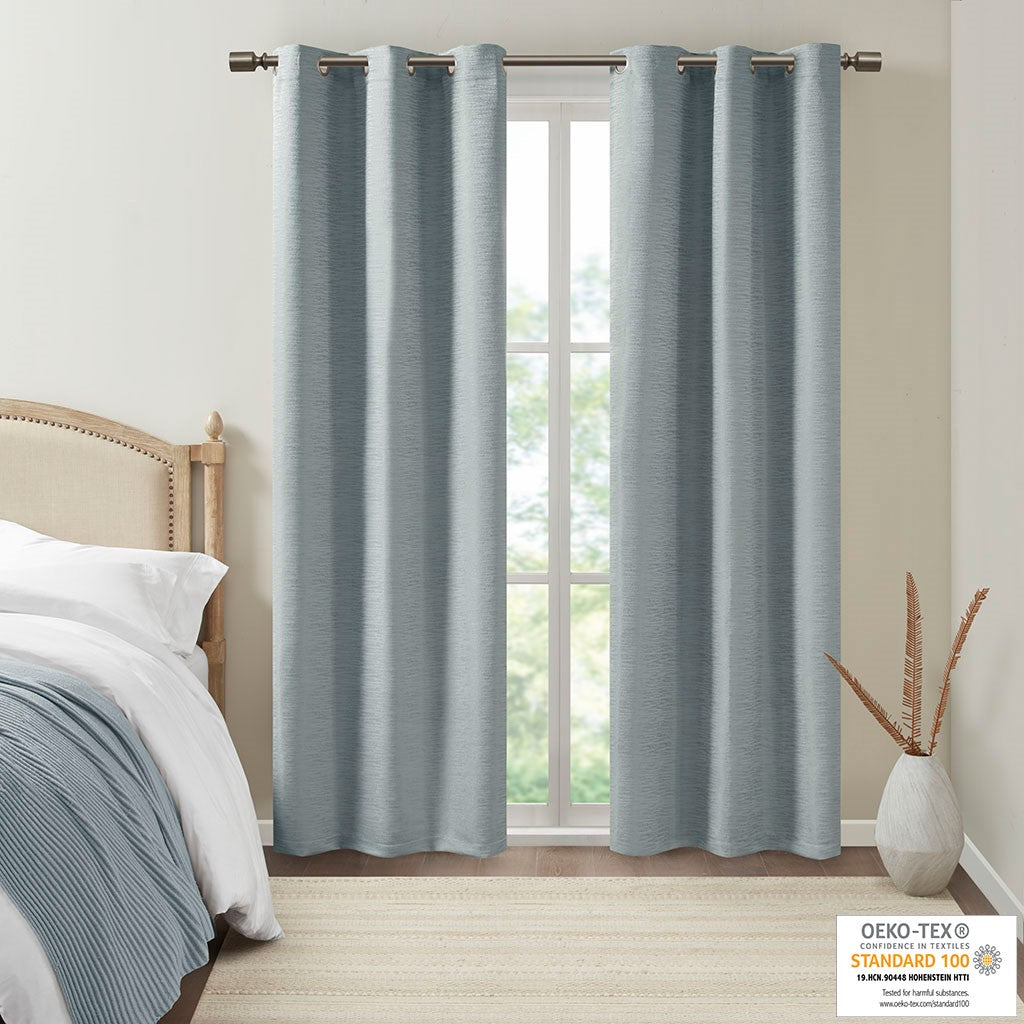 Create a relaxing space in your home with the Beautyrest Rocky Solid Textured Jacquard Total Blackout Magnetic Closure Panel Pair. This solid color curtain pair features a light sheen and beautiful texture from the jacquard woven fabric, for a subtle and stylish update. Using thermal technology, these curtains help provide maximum energy savings by keeping your room the perfect temperature throughout the year. While magnetic closures on each panel ensure the curtains stay join together, blocking out all outside light and noise intrusion for the highest level of privacy, making these perfect for your bedroom or media room. These blackout curtains are also OEKO-TEX certified, meaning they do not contain any harmful substances or chemicals, for quality comfort and wellness. Finished with silver grommet tops that fit up to a 1.25 inch diameter rod; curtains are also Machine washable for easy care. Complete the look with other coordinating patterns in the Beautyrest window collection, available and sold separately; simply style by layering pairs together to cover large windows/doors or hang pairs separately throughout your home for a cohesive look.
