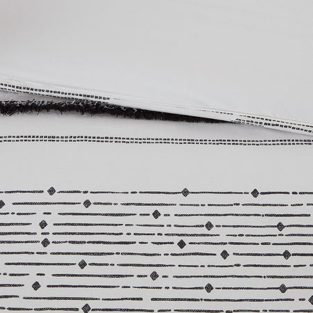 Give your bedroom a shabby chic update with the INK+IVY Cotton Printed Comforter Set with Trims. The 100% cotton comforter features a black stripe print with 6 rows of cotton tufted trims that add dimension to the charming boho look. Hidden bar tacks on the top of the comforter create a clean, duvet-like finish and the solid black reverse adds a bold touch to the design. Matching shams with 1-inch self-flanges and overlap closures on the back provide the finishing touches to this cotton comforter set. Items in the set may come in a rolled or compressed packaging, which will need to be fluffed up or steam ironed before use to remove wrinkles.