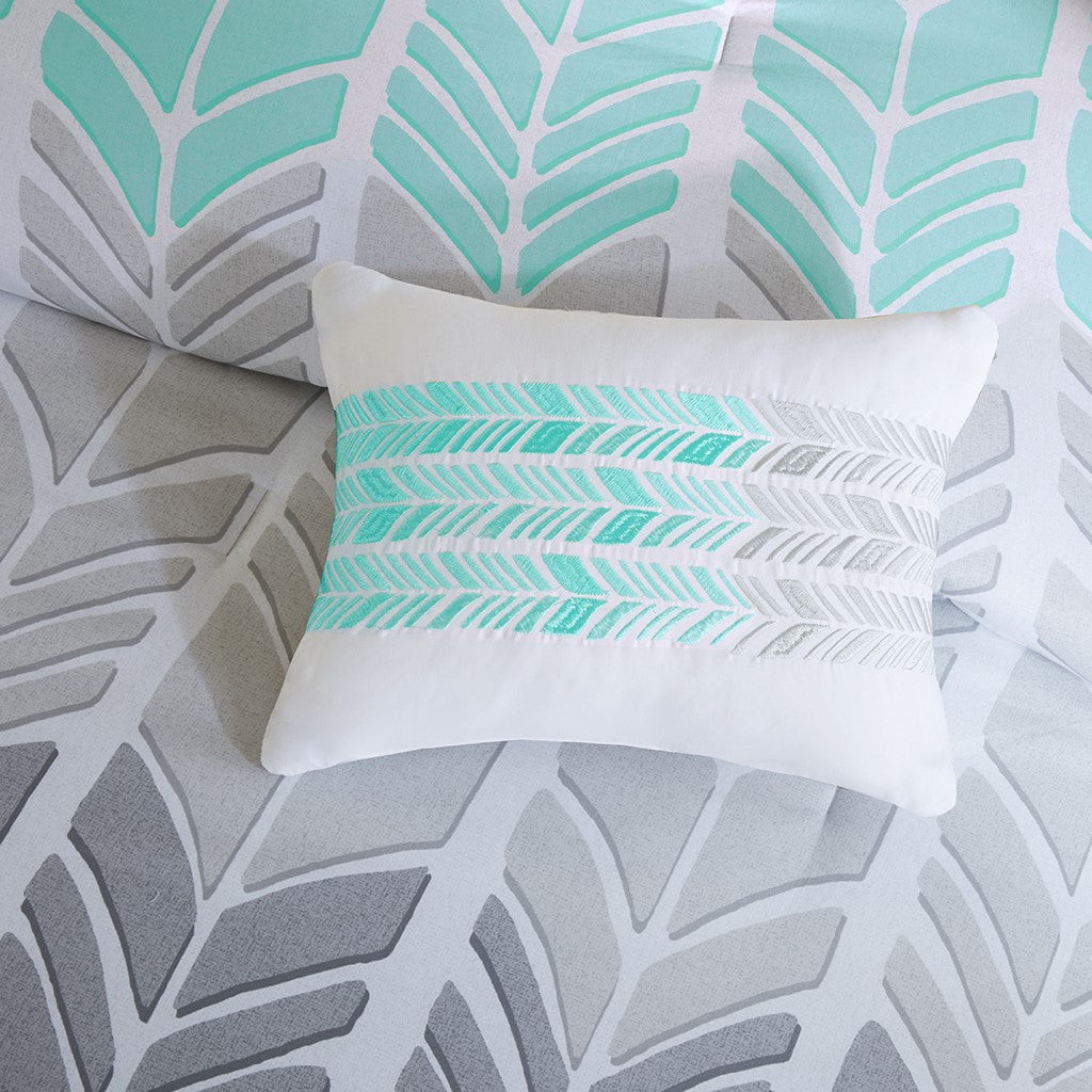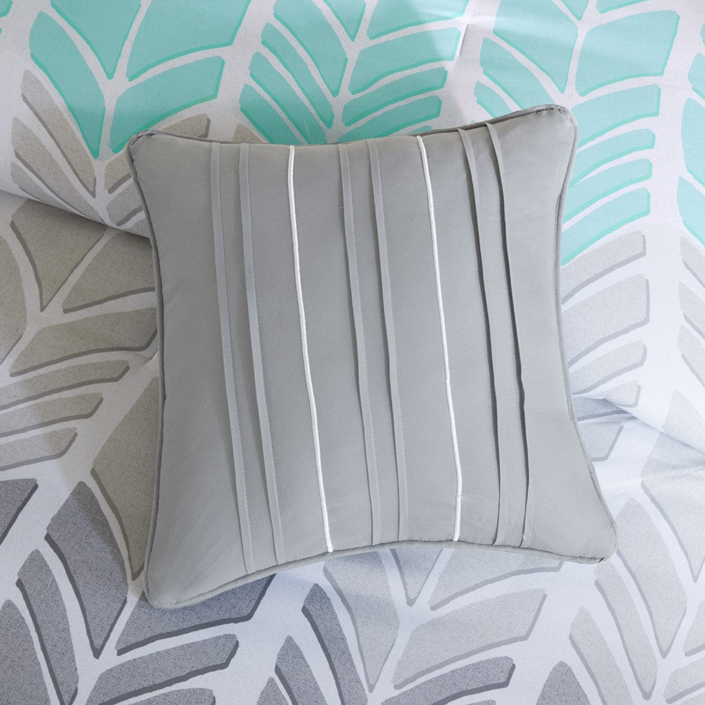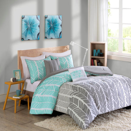The Intelligent Design Abby Metallic Printed and Pintucked Comforter Set brings a fierce touch of glam to your bedroom. A vibrant metallic print in a blue aqua hue and chic pintucking adorns the face of the comforter for a stunning look. The matching shams (1 in Twin/TwinXL) coordinate perfectly with the comforter, while oblong and square decorative pillows provide the finishing touches. Machine washable for easy care, this contemporary comforter set adds a glamorous update to your bedroom decor. This bedding set has an antimicrobial treatment that provides built-in freshness protection, reducing the growth of odor causing bacteria to keep fabric lasting longer. Items in the set may come in a rolled or compressed packaging, which will need to be fluffed up or steam ironed before use to remove wrinkles.