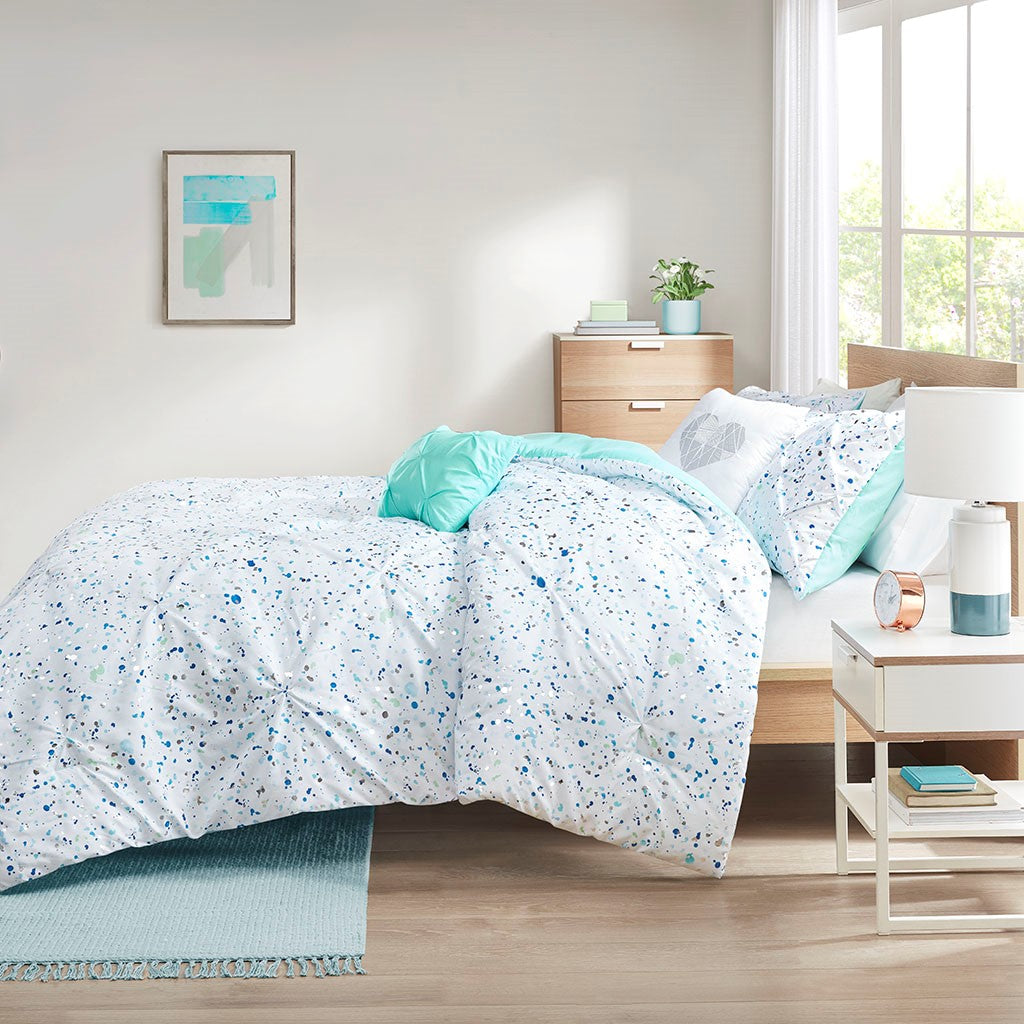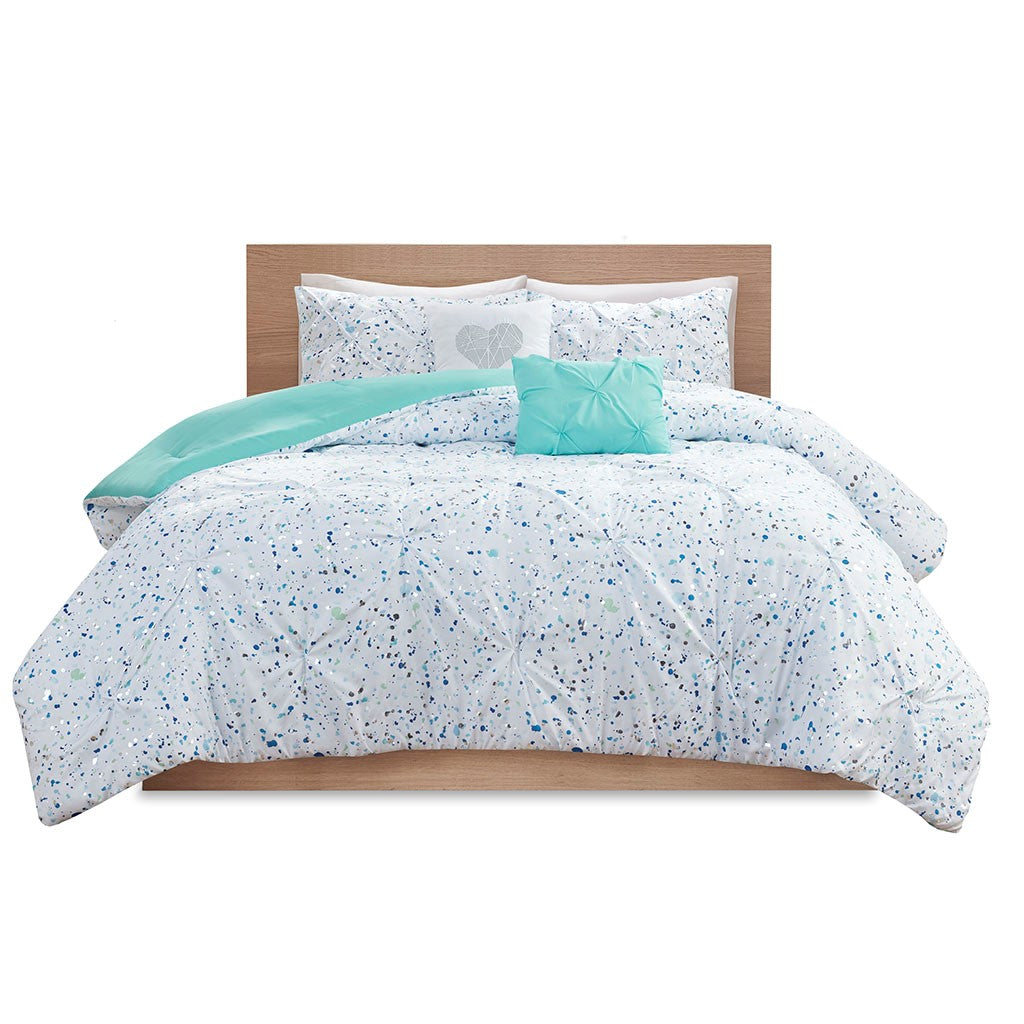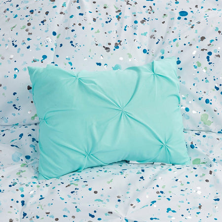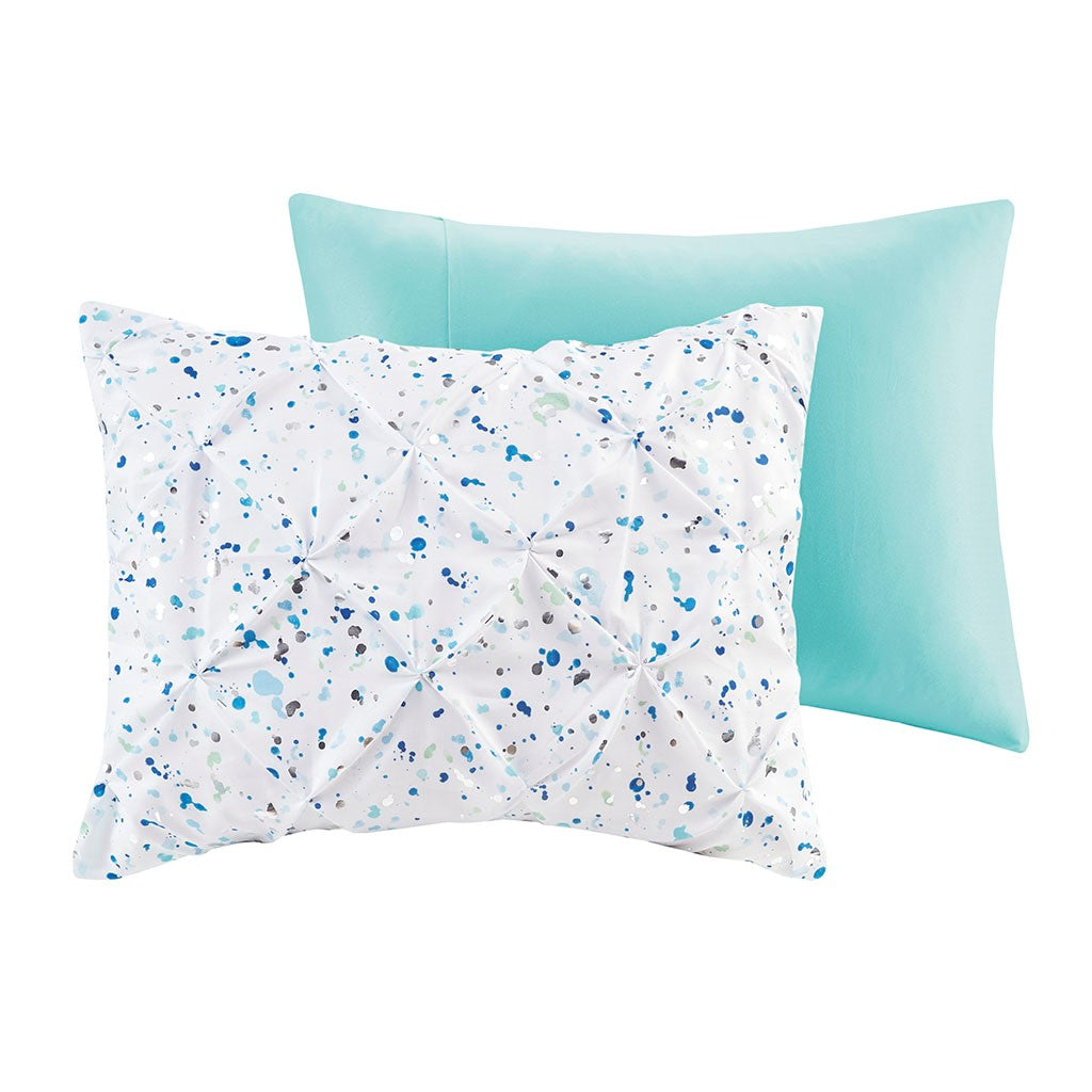 The Intelligent Design Abby Metallic Printed and Pintucked Comforter Set brings a fierce touch of glam to your bedroom. A vibrant metallic print in a blue aqua hue and chic pintucking adorns the face of the comforter for a stunning look. The matching shams (1 in Twin/TwinXL) coordinate perfectly with the comforter, while oblong and square decorative pillows provide the finishing touches. Machine washable for easy care, this contemporary comforter set adds a glamorous update to your bedroom decor. This bedding set has an antimicrobial treatment that provides built-in freshness protection, reducing the growth of odor causing bacteria to keep fabric lasting longer. Items in the set may come in a rolled or compressed packaging, which will need to be fluffed up or steam ironed before use to remove wrinkles.