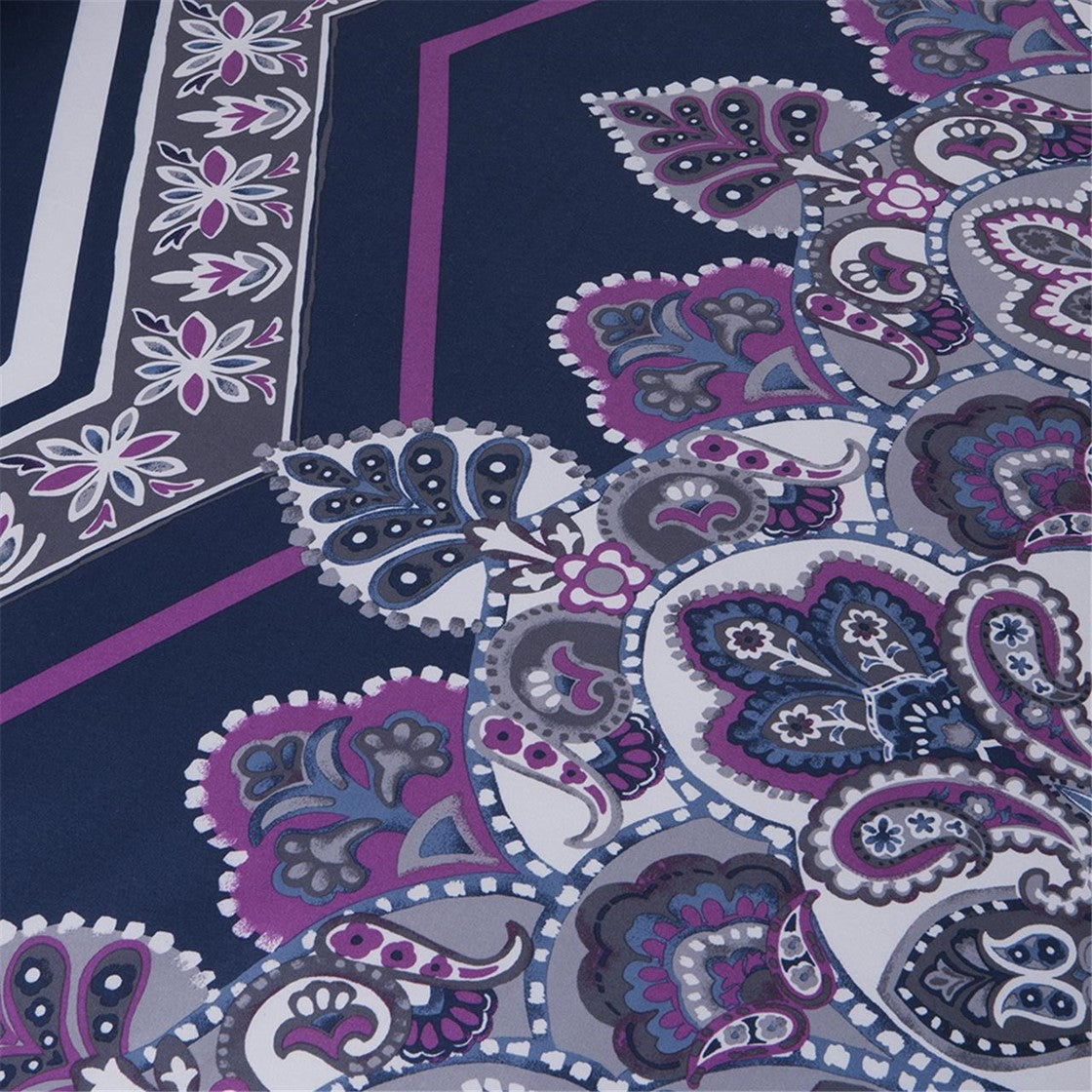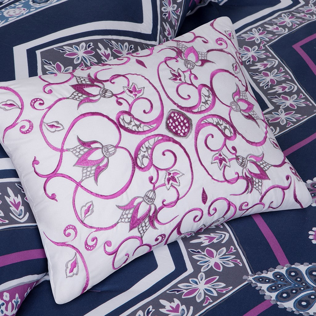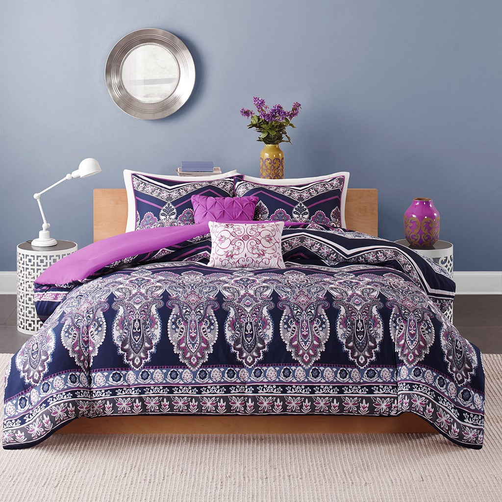 The Intelligent Design Adley Comforter Set mixes globally inspired and modern prints to create a beautiful look. A chevron pattern with floral prints on the top half of the comforter complements the paisley print on the bottom half, for a chic look. A solid purple reverse adds a brilliant splash of color to brighten up the comforter. The 2 coordinating shams (1 in Twin/TwinXL) pair beautifully with the comforter and 2 decorative pillows provide the finishing touches to this boho-inspired comforter set. This contemporary comforter has antimicrobial treatment that provides built-in freshness protection, reducing the growth of odor causing bacteria to keep fabric lasting longer.