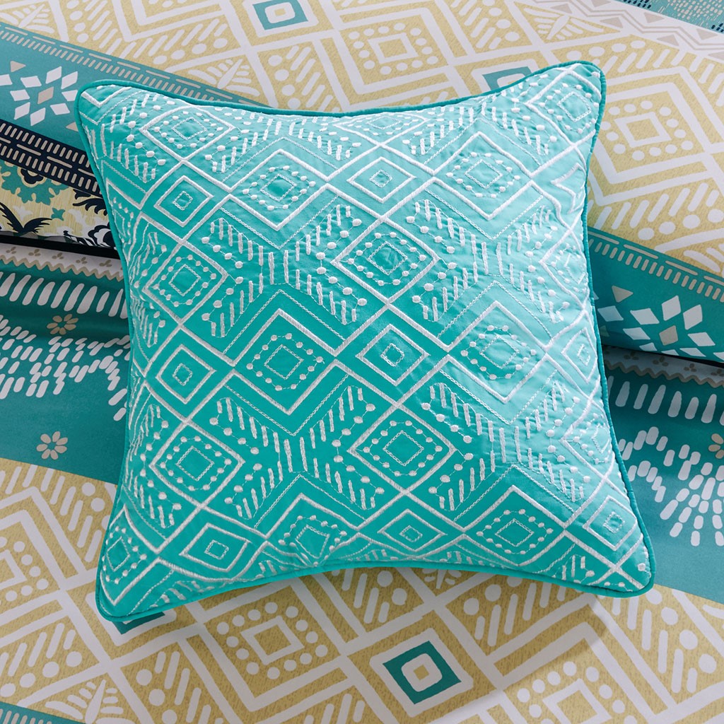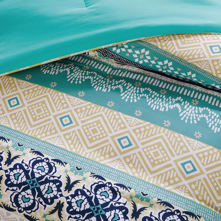 The Intelligent Design Arissa Comforter Set offers a bright and colorful update to your bedroom. This microfiber comforter features medallion and geometric prints in bold stripes and colors to invigorate your space with a chic boho look. A solid aqua reverse adds a vibrant splash of color to the comforter set. The 2 matching shams (1 in Twin/TwinXL) complement the top of the bed, while 2 decorative pillows provide the charming finishing touches to the comforter set. This boho comforter set also has an antimicrobial treatment that provides built-in freshness protection, reducing the growth of odor causing bacteria to keep fabric lasting longer.