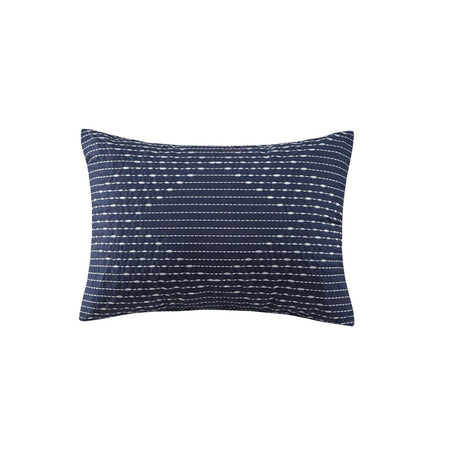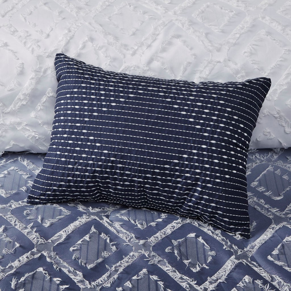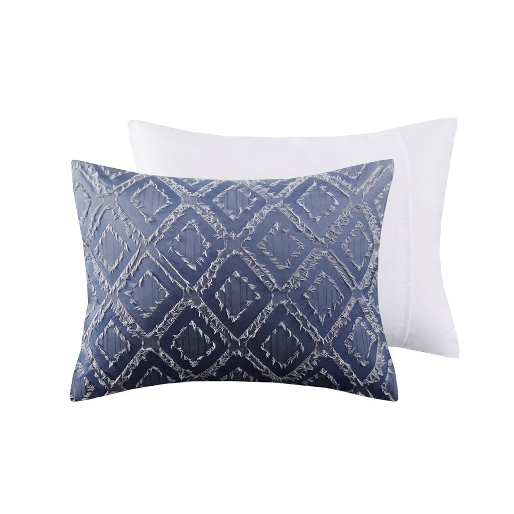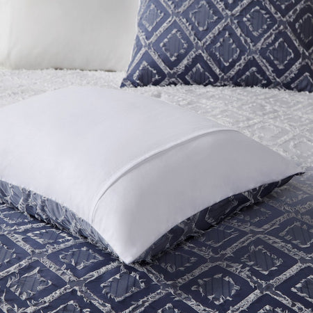 Make a statement with the gorgeous design of the Intelligent Design Ava Ombre Printed Clipped Jacquard Comforter Set. This ombre comforter flaunts a diamond clipped jacquard pattern that flows from white to navy, for a modern glam look. The 2 matching shams (1 in Twin/TwinXL) also feature the diamond jacquard design to complement the textured comforter. Also included is an oblong decorative pillow that provides a charming finishing touch to the ombre bedding set. Machine washable for easy care, this contemporary comforter set also has an antimicrobial treatment that provides built-in freshness protection, reducing the growth of odor causing bacteria to keep fabric lasting longer.