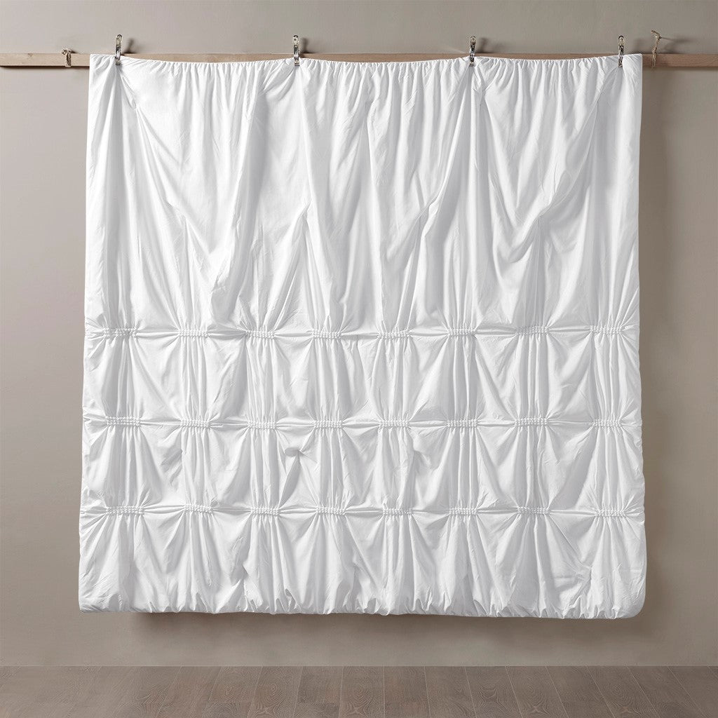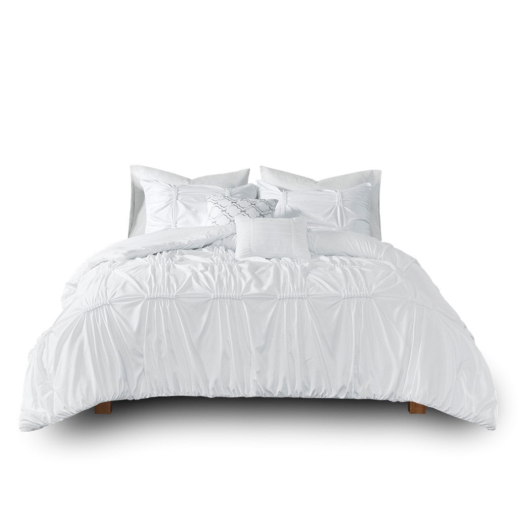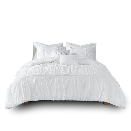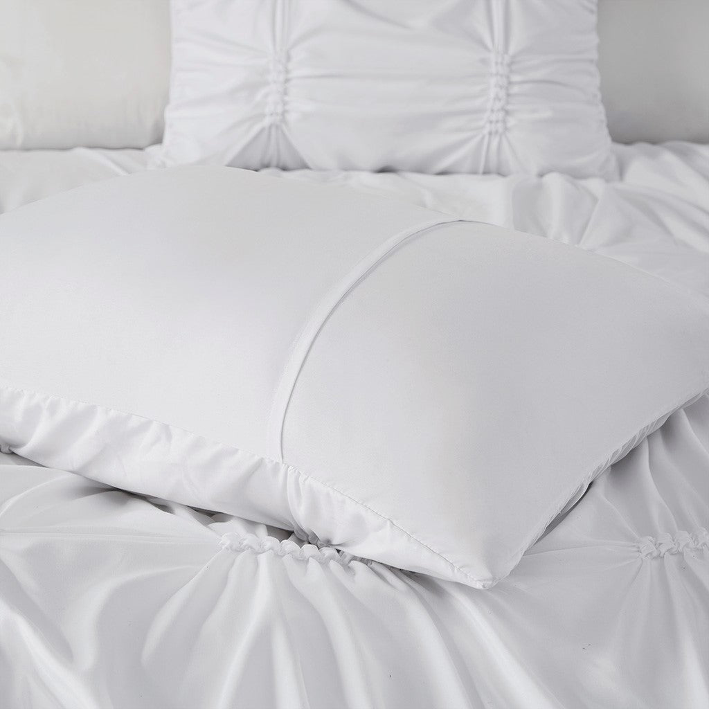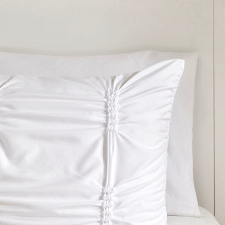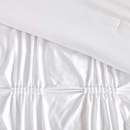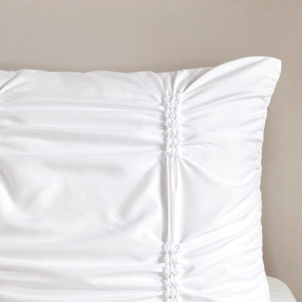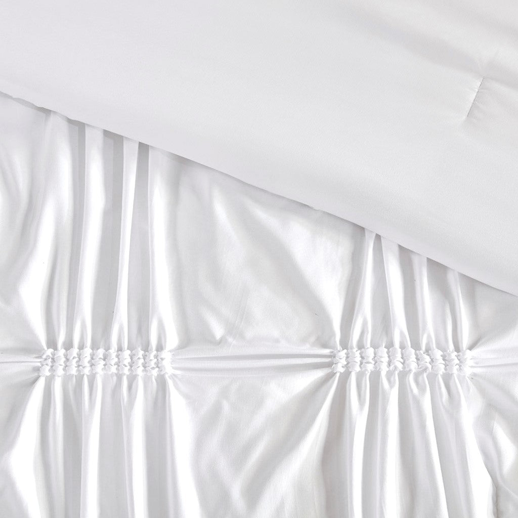 - Casual elegance white comforter set features 2 rows of elastic embroidery with pleating