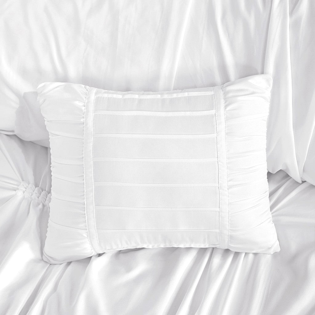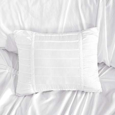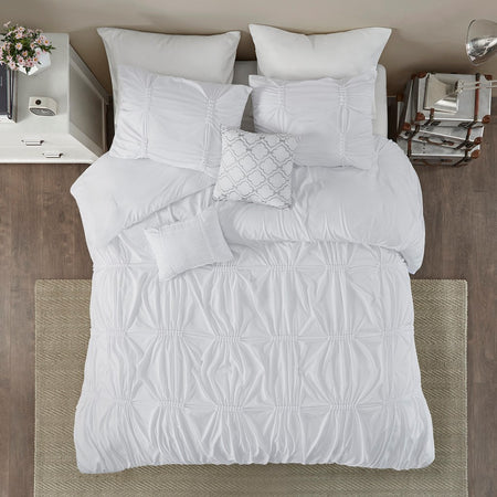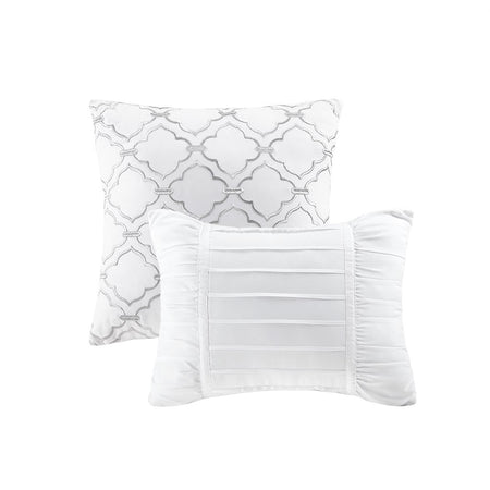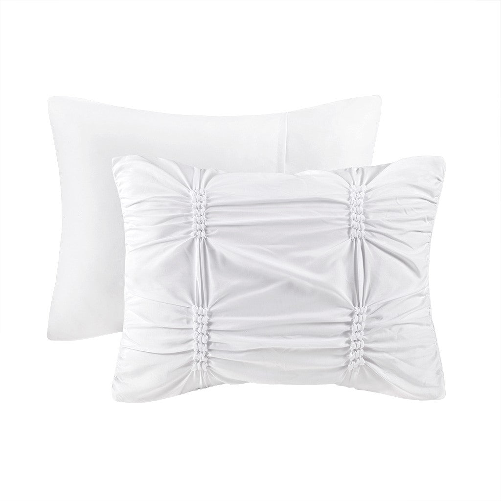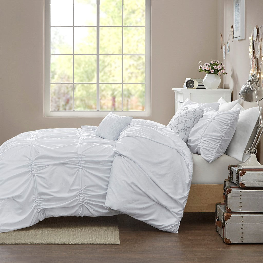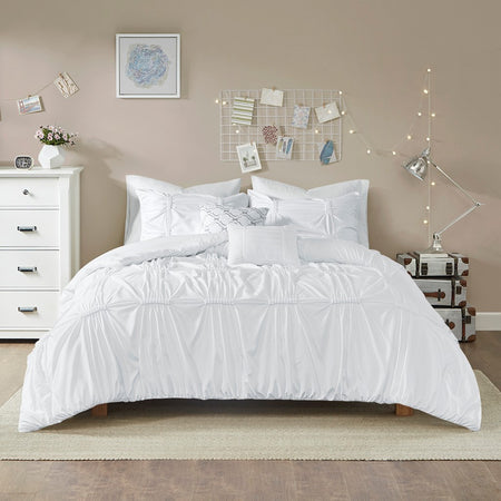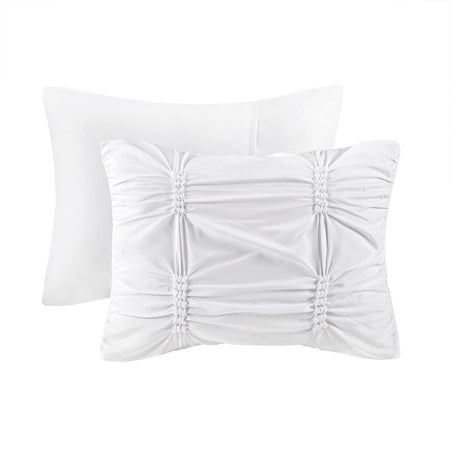 Style your space with the casual elegance of the Intelligent Design Benny Comforter Set. The beautiful white comforter and shams (1 in Twin/TwinXL) feature elastic embroidery with pleated panels that add dimension and charm to the bedding set. A square decorative pillow with metallic embroidery makes a statement on top of the bed, while an oblong pillow with fabric manipulation provides a charming finishing touch. This bedding set uses an antimicrobial treatment that provides built-in freshness protection, reducing the growth of odor causing bacteria to keep fabric lasting longer.
