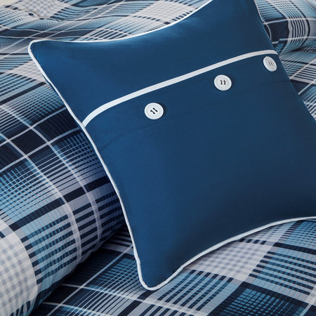 Bring a stylish and updated look to your bedroom with the Intelligent Design Camilo Comforter Set. This microfiber plaid comforter features a handsome mix of blue colors with a solid blue reverse to create a chic modern look. The 2 matching shams (1 in Twin/TwinXL) repeat the design of the comforter, while 2 decorative pillows with embroidered details provide the finishing touches. This comforter set has an antimicrobial treatment that provides built-in freshness protection, reducing the growth of odor causing bacteria to keep fabric lasting longer. Items in the set may come in a rolled or compressed packaging, which will need to be fluffed up or steam ironed before use to remove wrinkles.