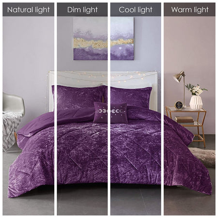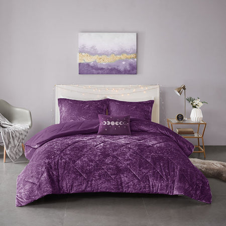 Create a luxuriously comfortable and lush bedroom space with the Intelligent Design Felicia Velvet Comforter Set. The crushed velvet, purple comforter features a quilted diamond top that adds dimension to the glamorous look. Matching shams (1 for Twin/Twin XL Sizes) coordinate with the velvet comforter, while an oblong decorative pillow provides the perfect finishing touch. Hypoallergenic polyester filling in the comforter and decorative pillow provide exceptional warmth and comfort. Machine washable for easy care, this velvet comforter set brings incredible softness and comfort with a glamorous flair to your bedroom decor. Items in the set may come in a rolled or compressed packaging, which will need to be fluffed up or steam ironed before use to remove wrinkles.