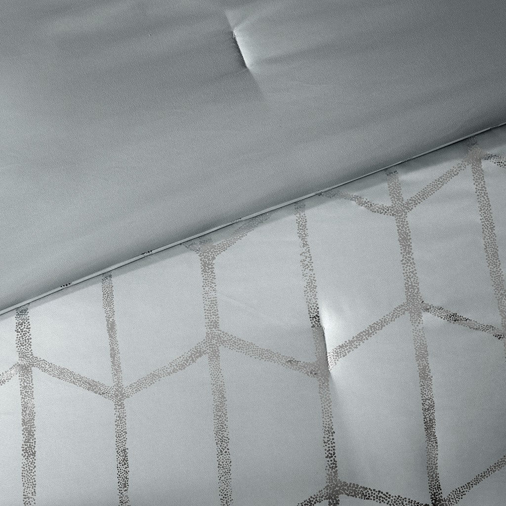 Freshen up your bedroom with the enchanting style of Intelligent Design's Raina Comforter Set. The stunning comforter flaunts a geometric, metallic silver print against a soft grey ground for a fun and eye-catching look! Matching sham(s) echo the design seen on top of the bed to pull the entire ensemble together. Two embroidered decorative pillows with typography and metallic details complete this fabulous, ultra-soft microfiber comforter set. Set includes comforter, 2 shams (1 sham in Twin/TwinXL), 1 oblong and 1 square decorative pillows. This bedding set uses an antimicrobial treatment that provides built-in freshness protection, reducing the growth of odor causing bacteria to keep fabric lasting longer. Items in the set may come in a rolled or compressed packaging, which will need to be fluffed up or steam ironed before use to remove wrinkles.