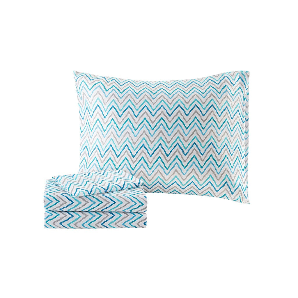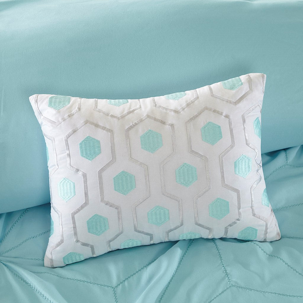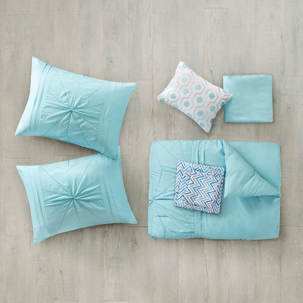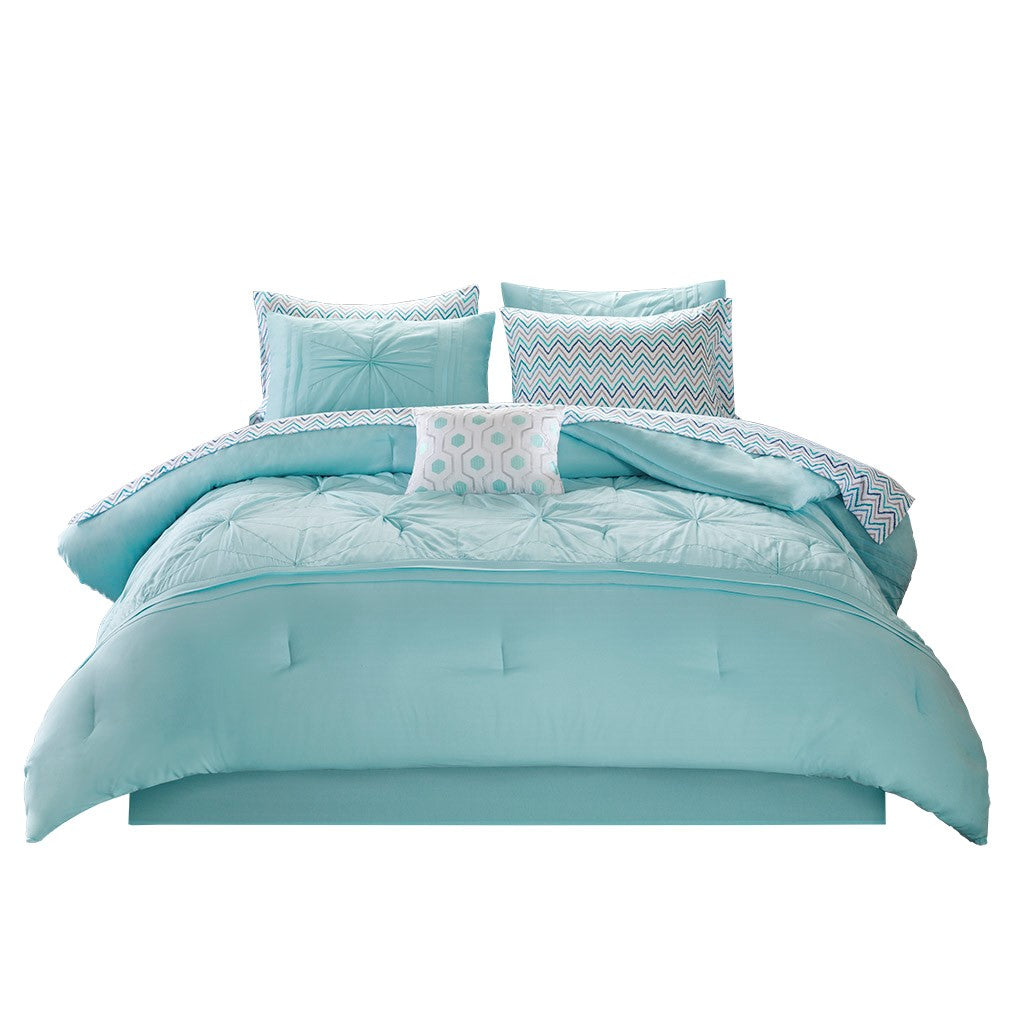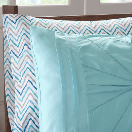 The Intelligent Design Toren Embroidered Comforter Set with Bed Sheets flaunts a simple elegance to elevate your bedroom. Embroidered pleating and stitching details adorn the top of the soft aqua comforter, adding texture and dimension to the top of the bed. Stylish shams (1 in Twin/TwinXL) display a similar pleated design and embroidered detailing seen on the comforter creating a fully coordinated look. A colorful chevron print sheet set and gorgeous decorative pillow adds a fun splash of color and style. The solid bed skirt provides a crisp and clean finishing touch to the comforter set. This bedding set is also OEKO-TEX certified, meaning it does not contain any harmful substances or chemicals to ensure quality comfort and wellness.