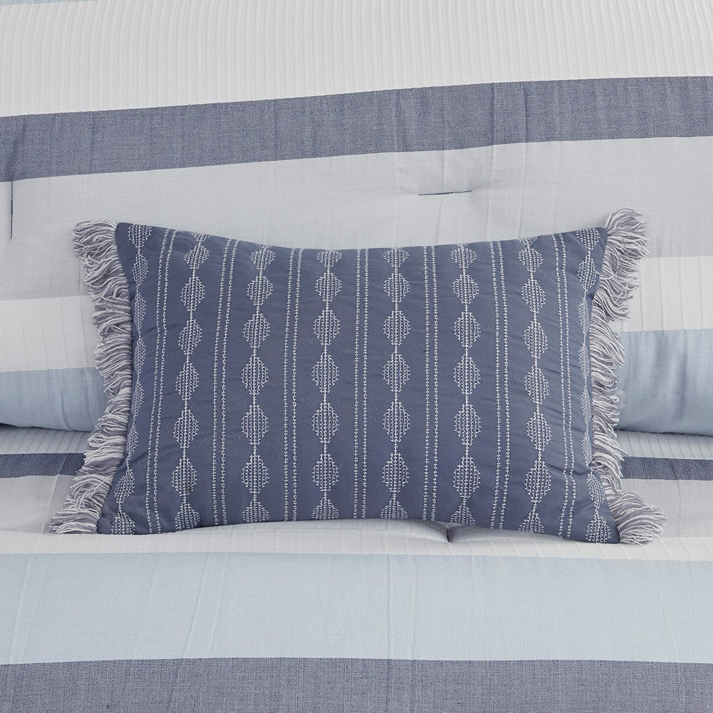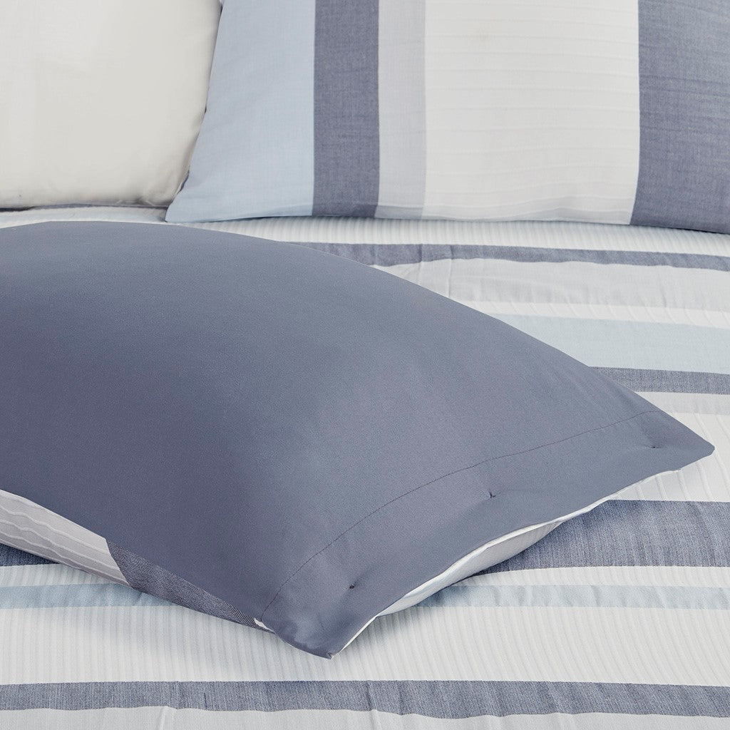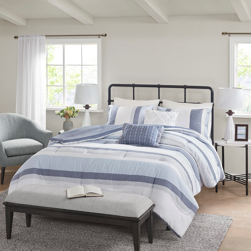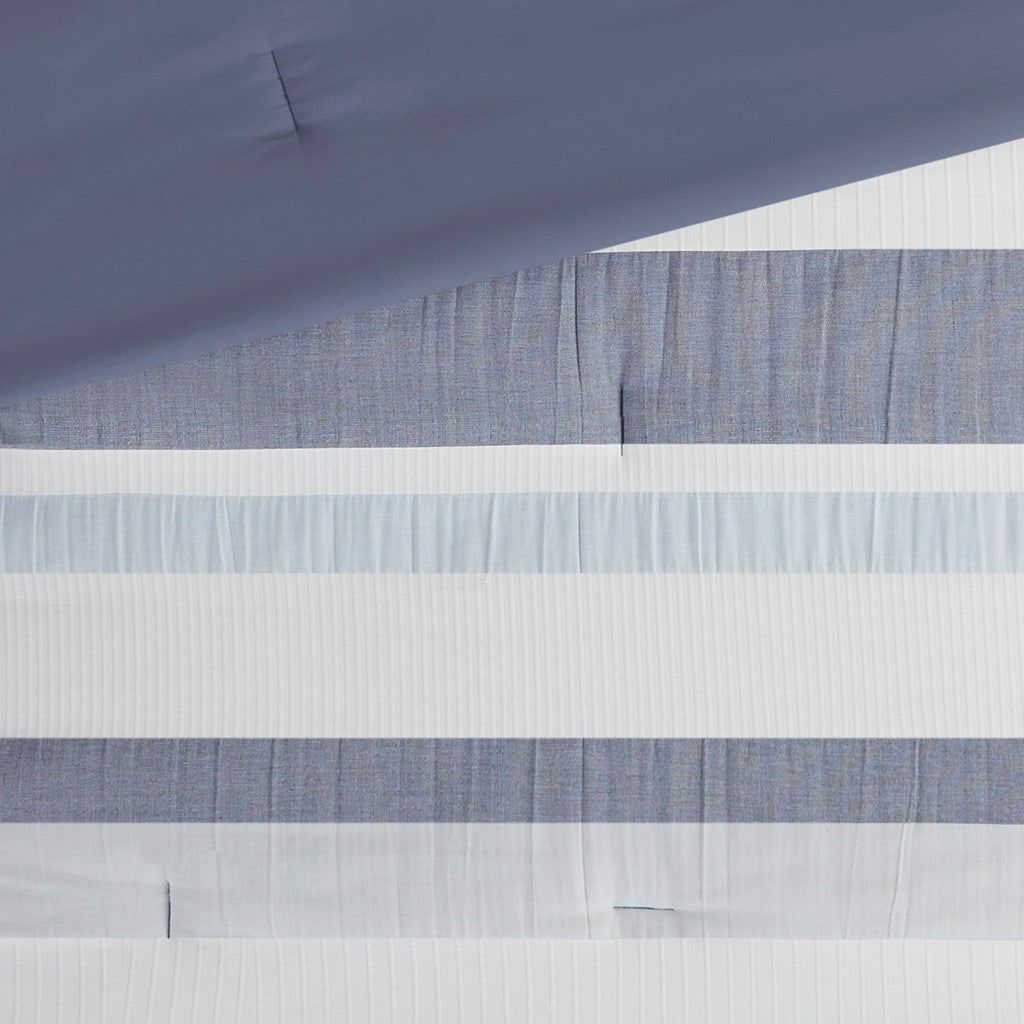 Refresh your bedroom with the casual charm of Madison Park's Allegany 5 Piece Jacquard Comforter Set. The jacquard comforter features a striped design, in blue, gray, and cream hues with a solid dark blue reverse, for an updated casual look. The matching shams pair handsomely with the farmhouse-inspired comforter, while an oblong and a square decorative pillow add textural elements to the comforter set. Hypoallergenic polyester filling in the comforter and pillows provides exceptional warmth and comfort all through the night. Machine washable for easy care, this jacquard comforter set has an antimicrobial treatment that provides built-in freshness protection, inhibits growth of odor causing bacteria, and keeps the fabric newer, longer. Bedding may come in rolled or compressed packing and will need to be fluffed up. Use a steam iron to help remove wrinkles easier.
