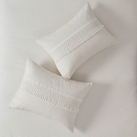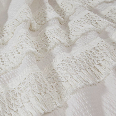 Restyle your bedroom with shabby chic allure of the Madison Park Amaya 3 Piece Cotton Seersucker Comforter Set. The ivory seersucker comforter is made from 100% cotton and features decorative tassel trims for a globally inspired look. Also included are two matching shams that mirror the unique design of the comforter.