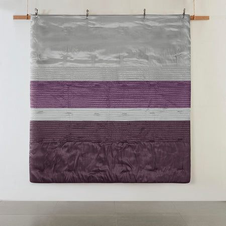 Amherst in Plum is perfect to add a splash of color to your bedroom. The violet and plum colors are paired back with a silver grey color that add a pop color to your room. The filled piping details that run horizontally across the comforter and vertically on the shams, add texture and dimension this this very simple and clean comforter. The reverse is magenta purple color.