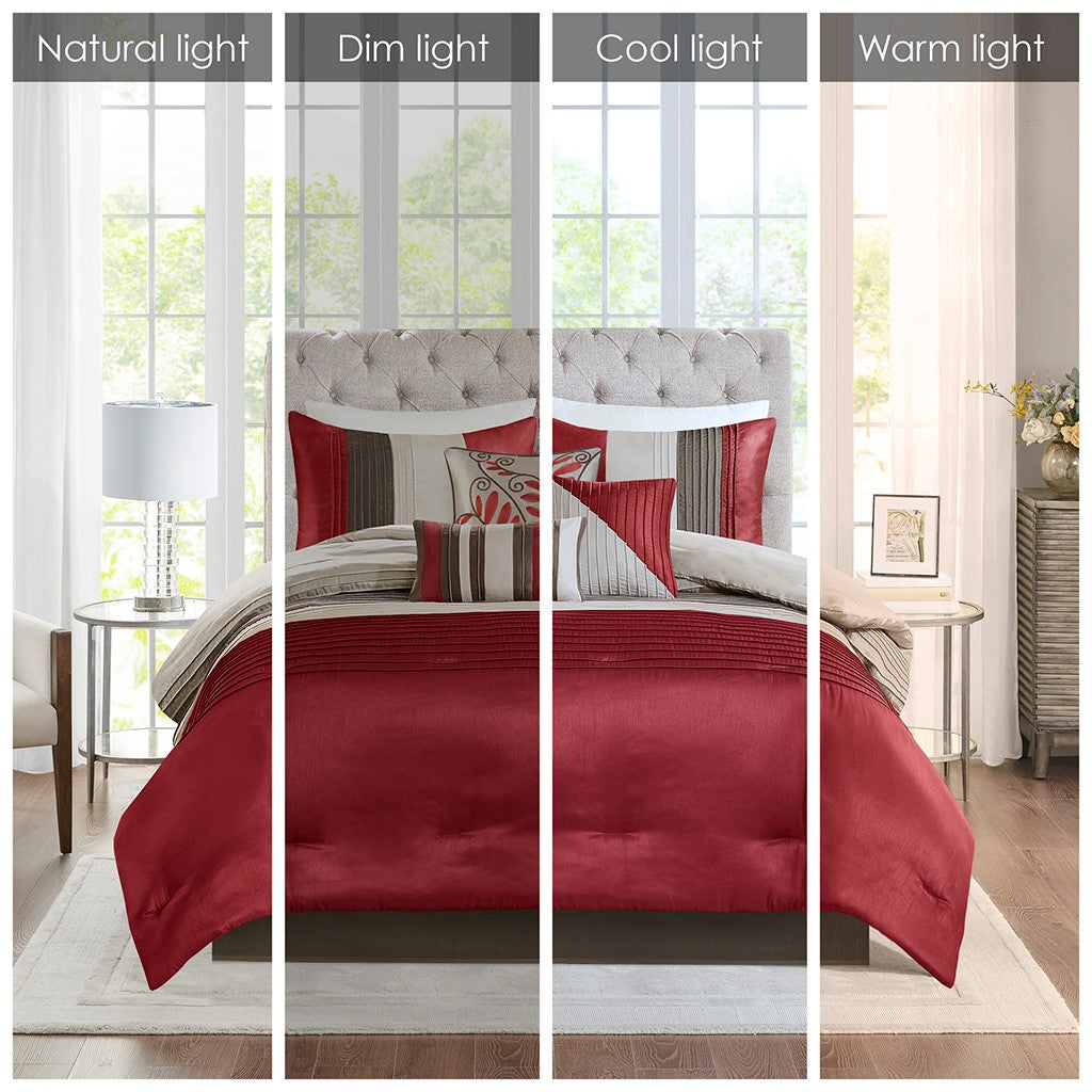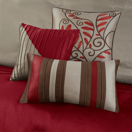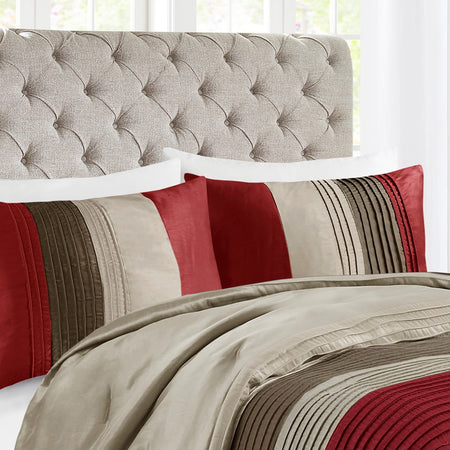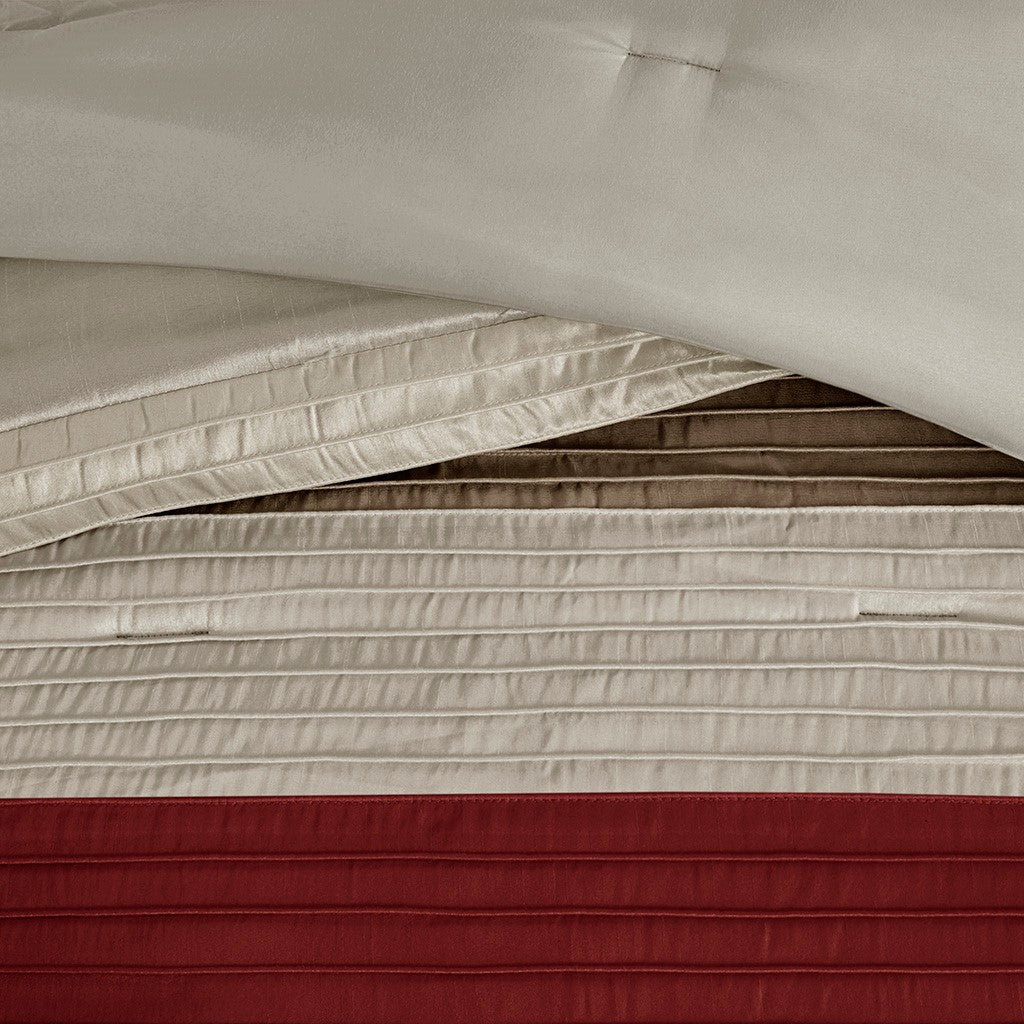 A modern twist to a classic color block bed. Amherst is made from a faux silk texture with pleating details to give it an update to a classic look. Features colors of crimson red, tan and brown.