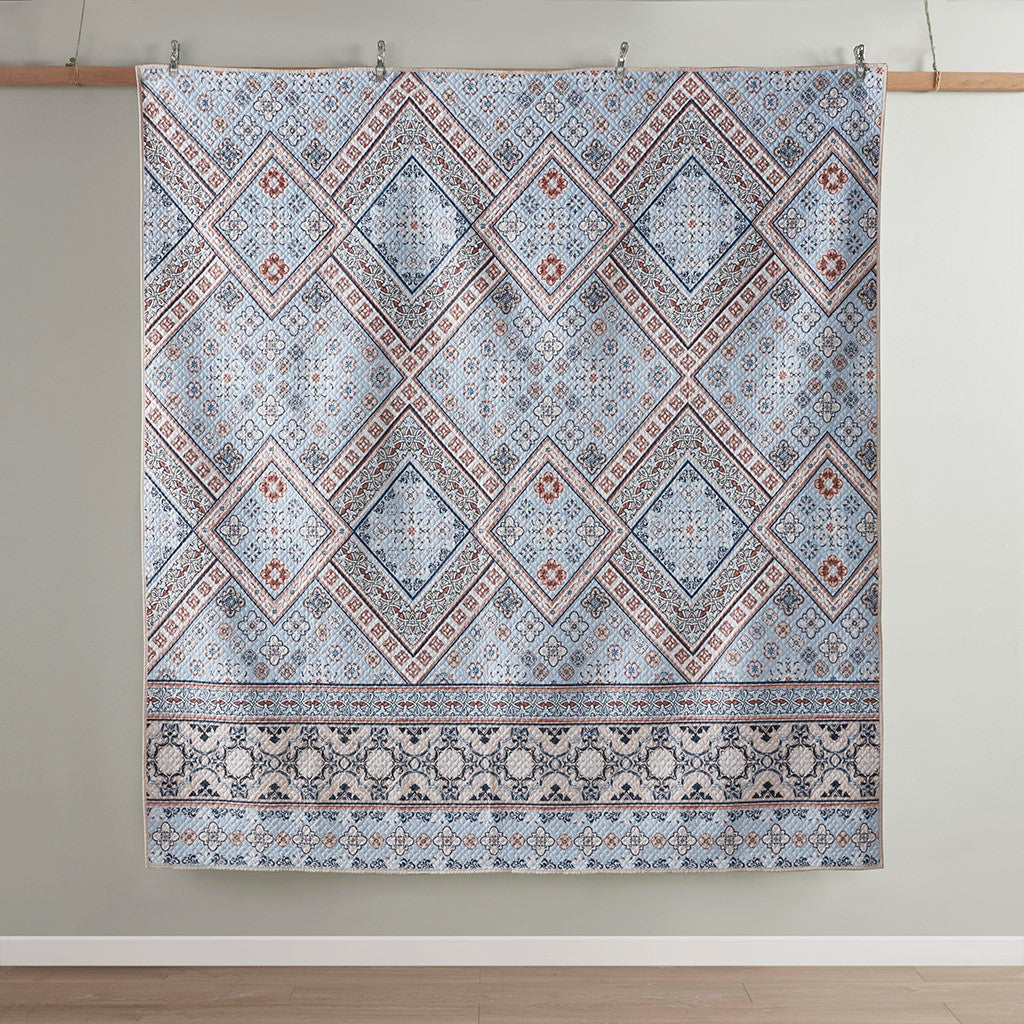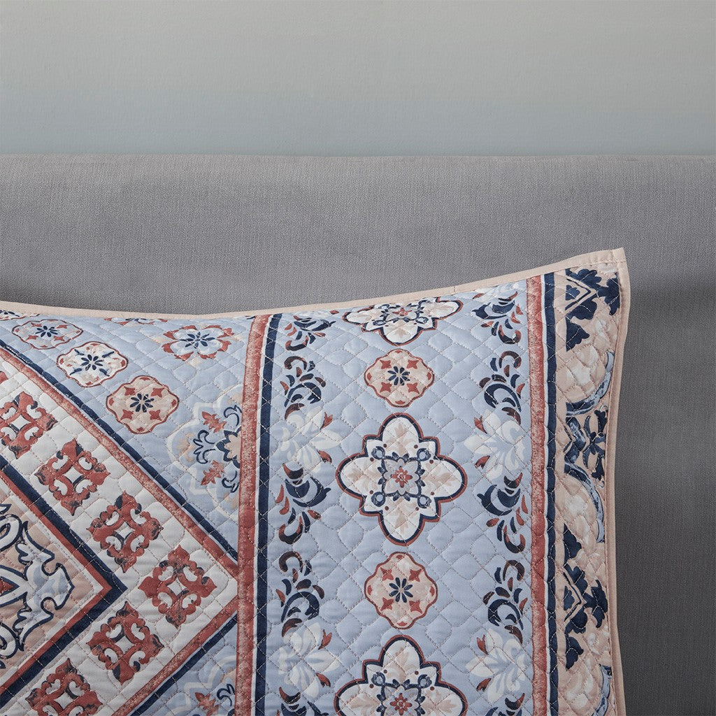 The Madison Park Anisa 3 Piece Printed Microfiber Coverlet Set offers a combination of modern and cottage styles to elevate your bedroom. This quilted coverlet features a blue and blush geometric print with a solid blush reverse to create an updated farmhouse look. The 2 matching shams repeat design of the coverlet to complete the quilted bedding set. Machine washable for easy care, this luxurious coverlet set is perfect for use in the summer or as an added layer of warmth in the winter. The reversible coverlet also has an antimicrobial treatment that provides built-in freshness protection, inhibits growth of odor causing bacteria, and keeps the fabric newer, longer.