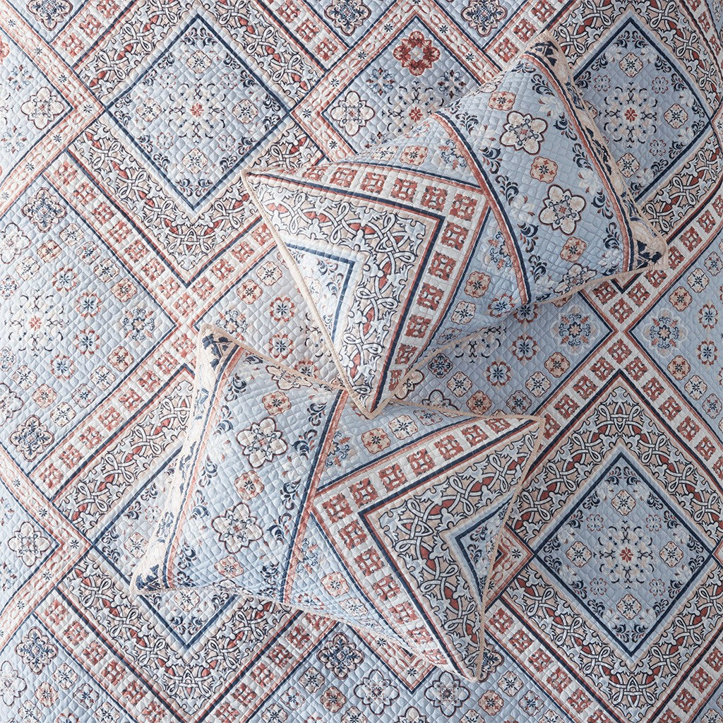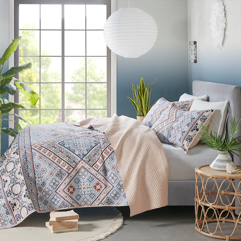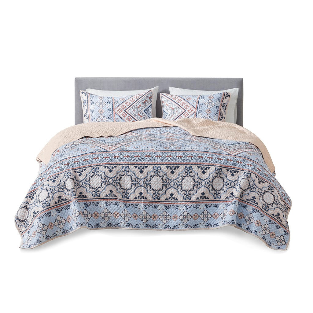 Anisa 3 Piece Printed Microfiber Reversible Coverlet Set - Blue / Blush - King Size / Cal King Size