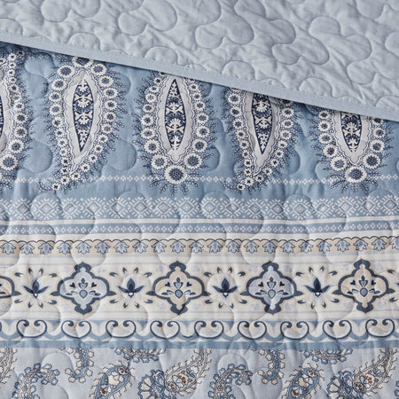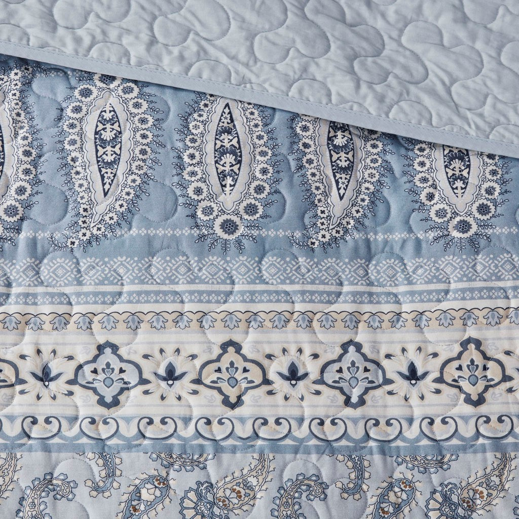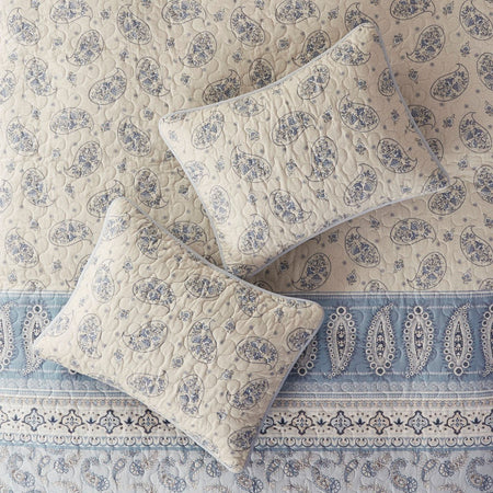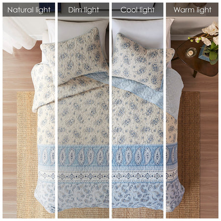 Transform your bedroom into a cozy retreat with the April 3 Piece Reversible Cotton Coverlet Set. This soft cotton coverlet features taupe and blue colors and different paisley prints with a solid blue reverse, for a charming farmhouse look. The 2 matching cotton shams coordinate with the top of the bed to complete the mini coverlet set. Machine washable for easy care, this farmhouse coverlet set is OEKO-TEX certified, meaning it does not contain any harmful substances or chemicals to ensure quality comfort and wellness. It also has an antimicrobial treatment that provides built-in freshness protection, inhibits growth of odor causing bacteria, and keeps the fabric newer, longer.