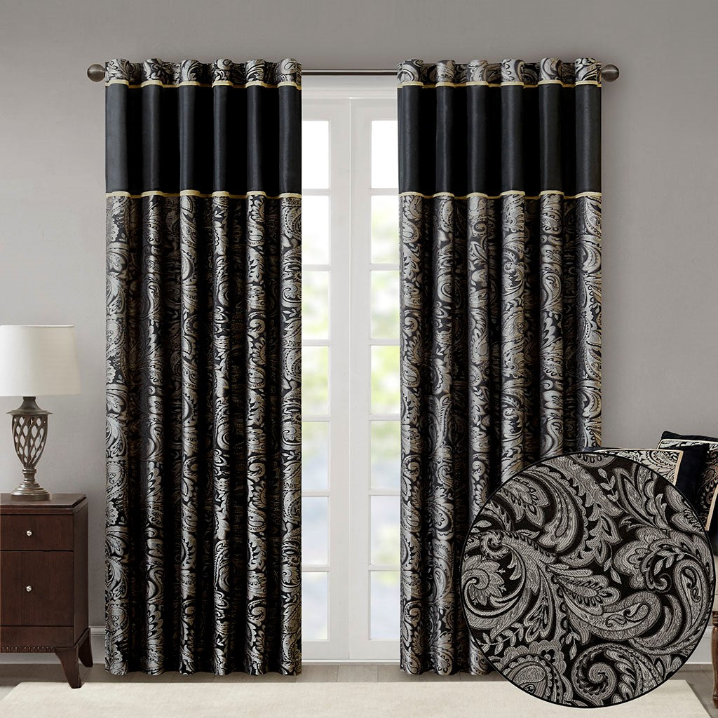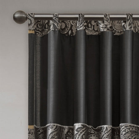 For a luxuriously classic style, our Madison Park Aubrey Window Curtain Pair is the perfect touch to your decor. The alluring jacquard weave is inspired from an updated paisley motif and is woven in beautiful hues of black, gold, and a hint of platinum for a shimmering accent. The window panels are pieced with solid faux silk and beautiful flat piping details in gold, creating an elegant look. While also achieving the OEKO-TEX certification, meaning it does not contain any harmful substances or chemicals, ensuring quality comfort and wellness. Rod pocket or back tabs top finish makes this curtain easy to hang, open, and close panels throughout the day; while fitting up to a standard 1.25" diameter rod. Coordinating bedding is also available and sold separately.