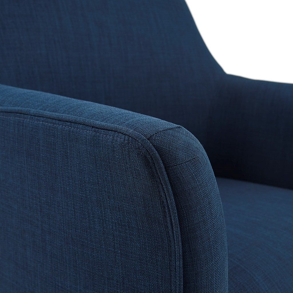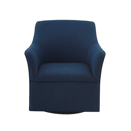 The Madison Park Augustine Swivel Glider Chair offers a simple and clean update to your living room decor. This swivel accent chair features a high back and flared arms upholstered in rich navy fabric that creates a smooth, seamless appearance. The black metal base allows the swivel chair to rotate 360 degrees as well as glide back and forth. With its chic transitional design, this swivel glider chair easily complements most living rooms or home offices. No assembly required.
