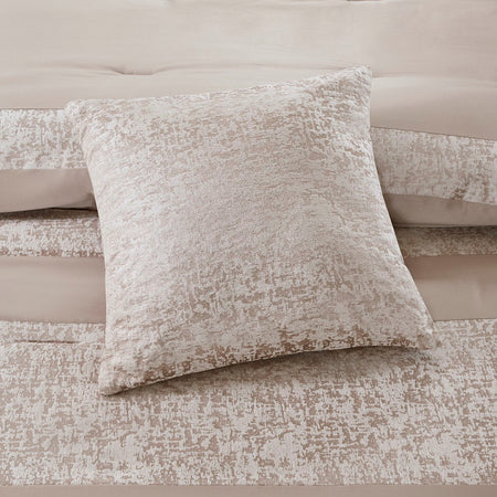The Madison Park Ava 7 Piece Chenille Jacquard Comforter Set offers a luxurious update to your bedroom decor. The luxurious taupe comforter and shams flaunt a pieced design with stripes of textured chenille jacquard that creates a stunning three dimensional effect. The 2 square decorative pillows and one oblong pillow are stuffed with hypoallergenic filling and feature embroidery and pleating details that provide elegant touches for the top of the bed. A solid taupe bed skirt completes the comforter set, giving the bed a clean finished look. Machine washable for easy care, this chenille jacquard comforter set is machine washable and brings a glamorous allure to your bedroom. Due to the nature of the chenille fabric, some shedding will occur naturally in the first 3-4 washes.