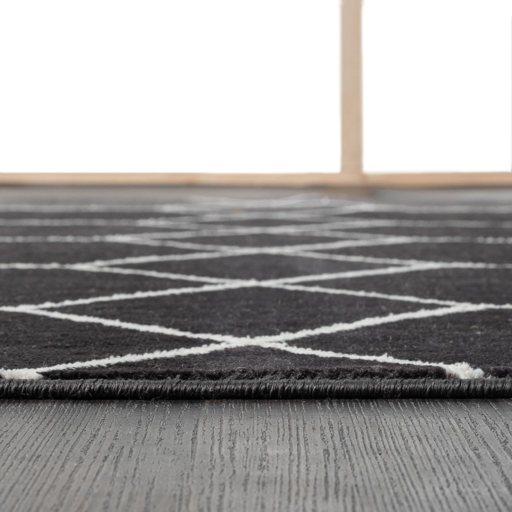 - Geometric trellis design in contrasting shades of black and cream
