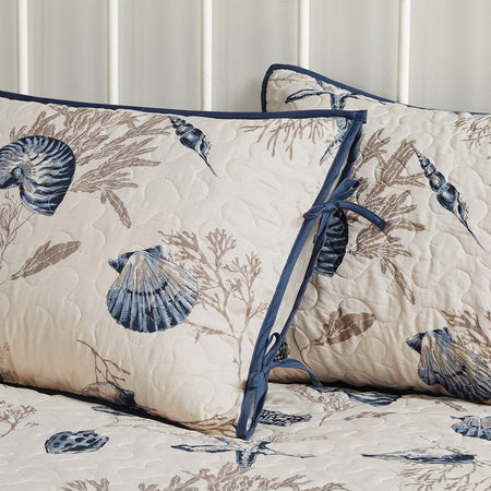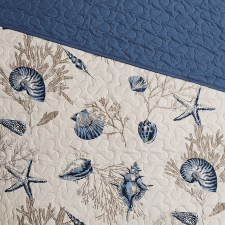 Create a coastal getaway right in your guest room with the Madison Park Bayside 6 Piece Reversible Daybed Cover Set. This quilted daybed features assorted blue seashells and a coral print with a solid blue reverse, for a charming coastal look. The 3 reversible matching shams repeat the pattern seen on the daybed and showcase a solid blue reverse to complement the bedding set. A solid blue bed skirt with a 15-inch drop and an oblong decorative pillow with an embroidered coral design provide the finishing touches to this coastal daybed cover set. Machine washable for easy care, this daybed bedding set easily fits a Twin size mattress.