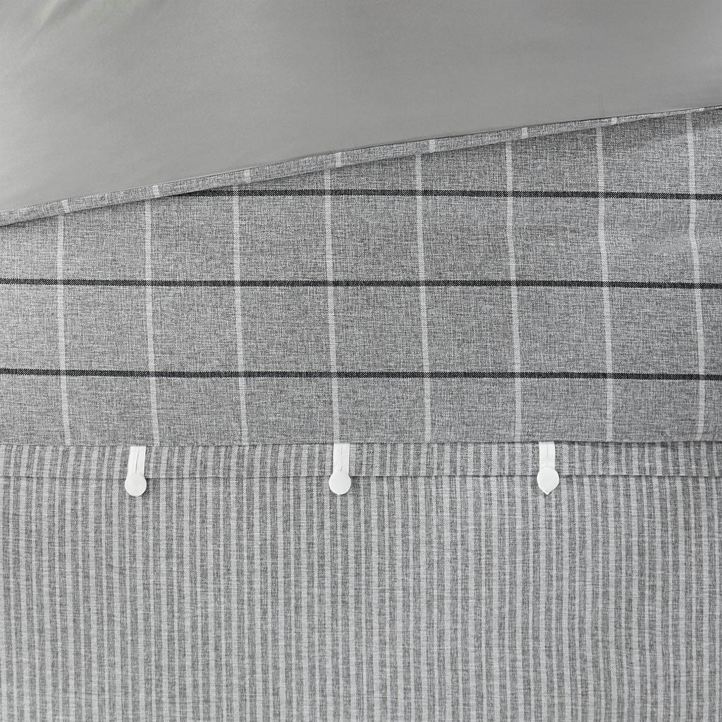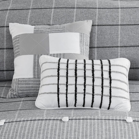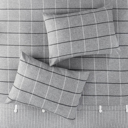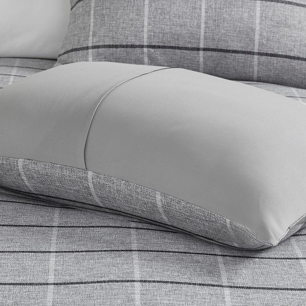 - Plaid pattern pieced with gray stripes on comforter with a solid gray reverse