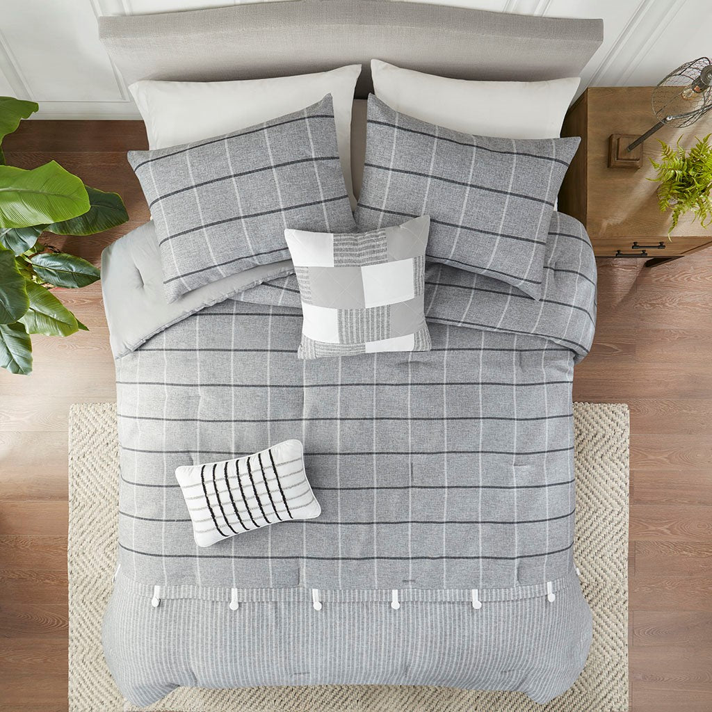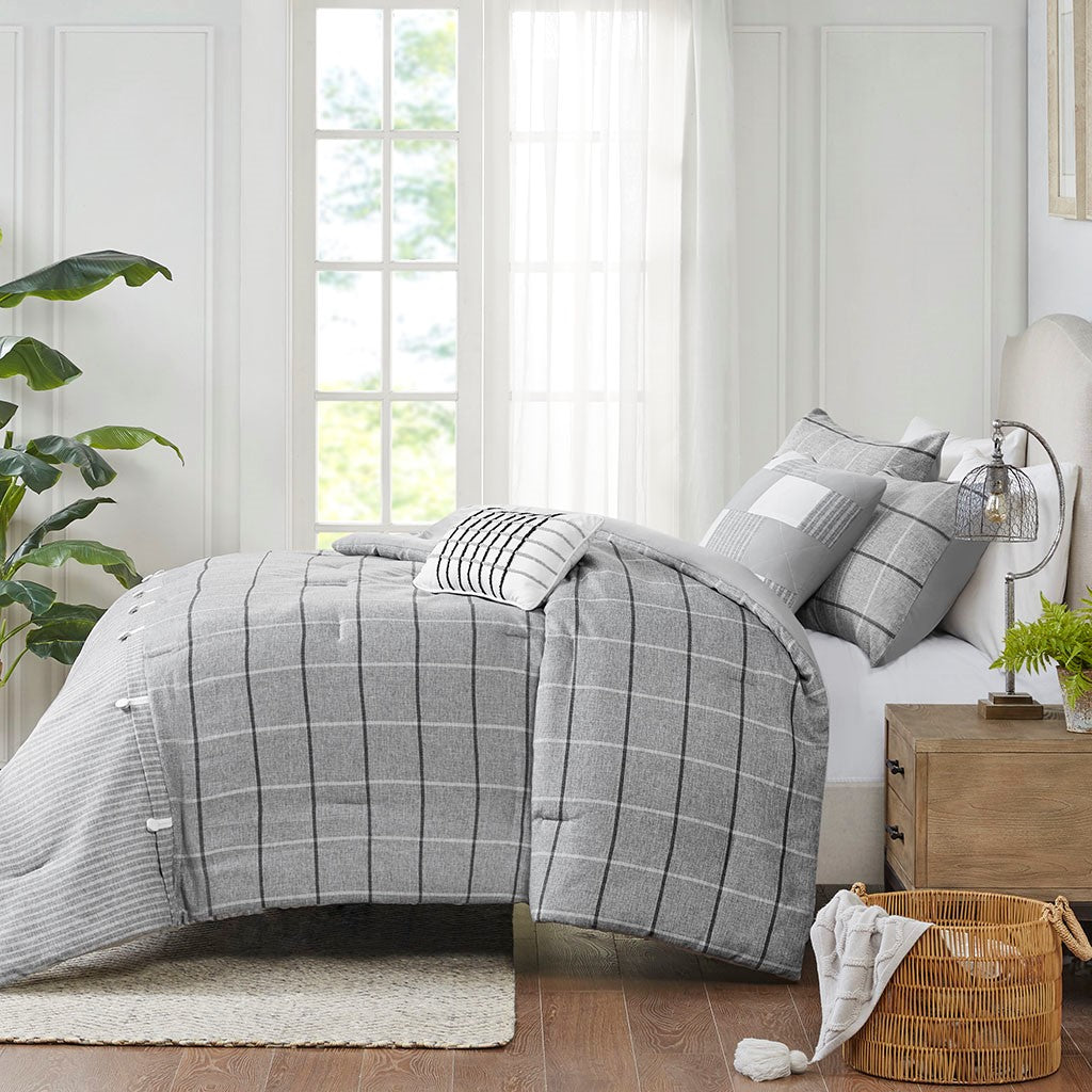 Bring a farmhouse charm to your bedroom with the Madison Park Bryson 5 Piece Comforter Set. Made from brushed buttery soft polyester fabric, this gray comforter features a plaid pattern with decorative buttons to create an upscale casual look. The two matching shams coordinate handsomely with the comforter, while 2 decorative pillows add stylish finishing touches to the farmhouse bedding set.