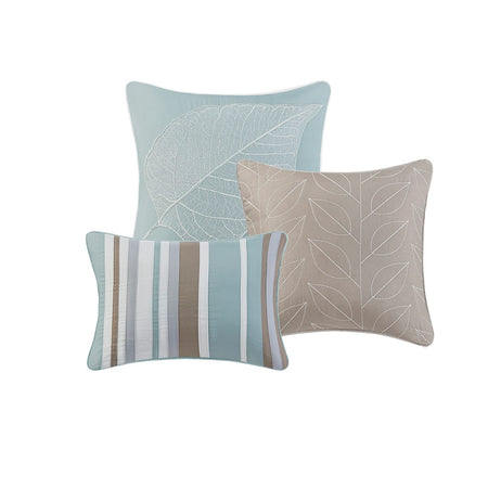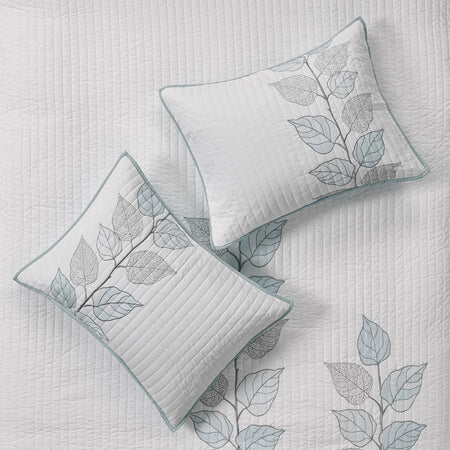 This beautiful 6 Piece Reversible coverlet set is a classic stylish look with an embroidered leaf print. Caelie is blue and white with subtle stripes that add texture. The coverlet reverses to a soft blue. With a microfiber polyester face and a brushed fabric reverse, this coverlet is soft to the touch and machine washable for easy care. Two matching standard shams and three embroidered decorative pillows complete the look. Queen size features two rows of embroidery, King size features three rows. Items in the set may come in a rolled or compressed packaging, which will need to be fluffed up or steam ironed before use to remove wrinkles.
