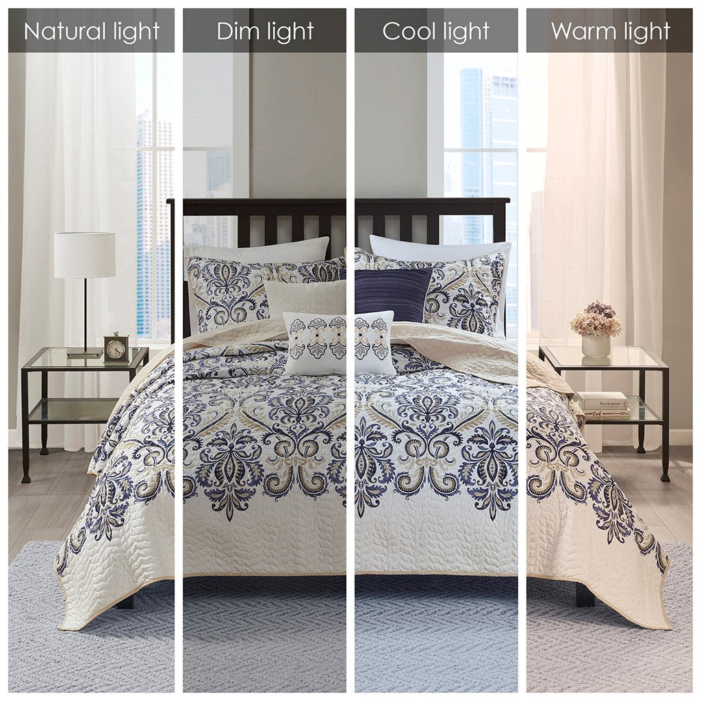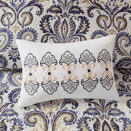 Create your modern space with the Madison Park Cali 6 Piece Reversible Coverlet Collection. This white ground features an updated paisley design in shades of navy and grey for the perfect color balance. Three decorative pillows features pleating and embroidery details to pull this whole look together.
