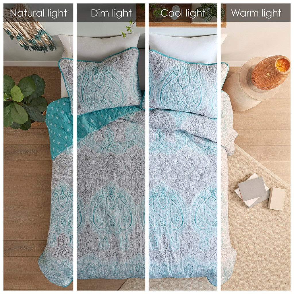 Cardi 3 Piece Reversible Cotton Coverlet Set - Teal - Full Size / Queen Size