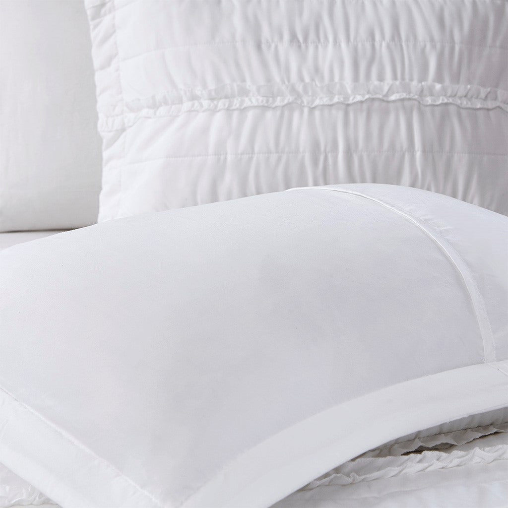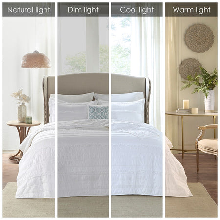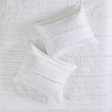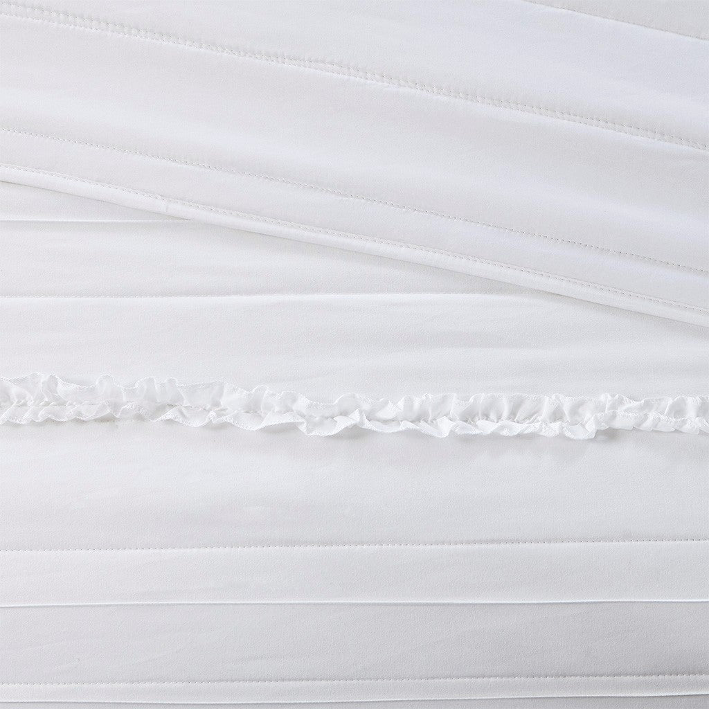 Create a shabby chic look in your bedroom with the Madison Park Celeste Collection. This solid reversible white coverlet has ruffles and quilting paired with a contrasting embroidered decorative pillow for a clean update for your space.