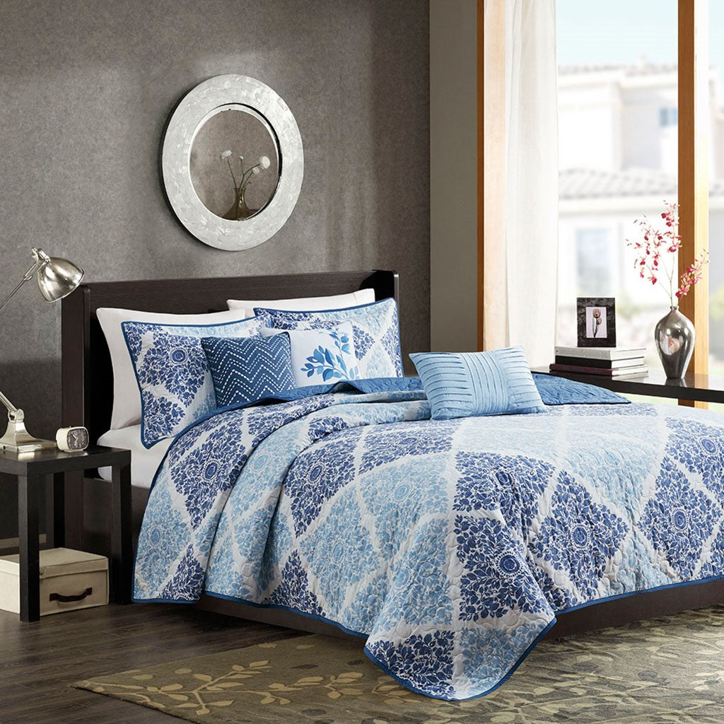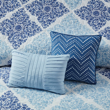 Claire 6 Piece Printed Quilt Set with Throw Pillows - Blue - King Size / Cal King Size
