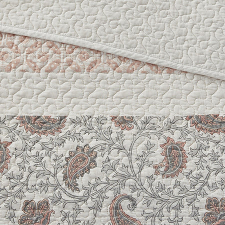The Madison Park Dawn 6 Piece Cotton Percale Reversible Coverlet Set offers a shabby chic update to your bedroom decor. A paisley print is featured on the cotton coverlet with pintucked fabric separated by lace taping embellishments. Matching shams mirror the design of the coverlet, while three decorative pillows and a solid bedskirt complete this reversible farmhouse coverlet set. This bedding set is also OEKO-TEX certified, meaning it does not contain any harmful substances or chemicals to ensure quality comfort and wellness. A coordinating shower curtain is available and sold separately. Items in the set may come in a rolled or compressed packaging, which will need to be fluffed up or steam ironed before use to remove wrinkles.