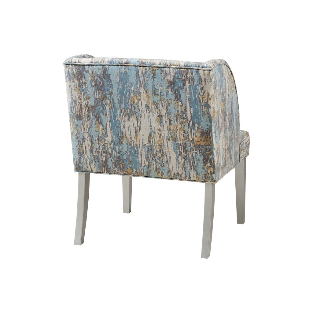 The Madison Park Delilah Accent Chair offers a charming and versatile update to your living room. This lounge chair is upholstered in a blue and grey abstract print fabric with a silver finish on the solid wood legs, for a chic transitional look. The flared arms and distinct back style create a uniquely elegant silhouette that complements and elevates your home decor. Leg assembly is required.