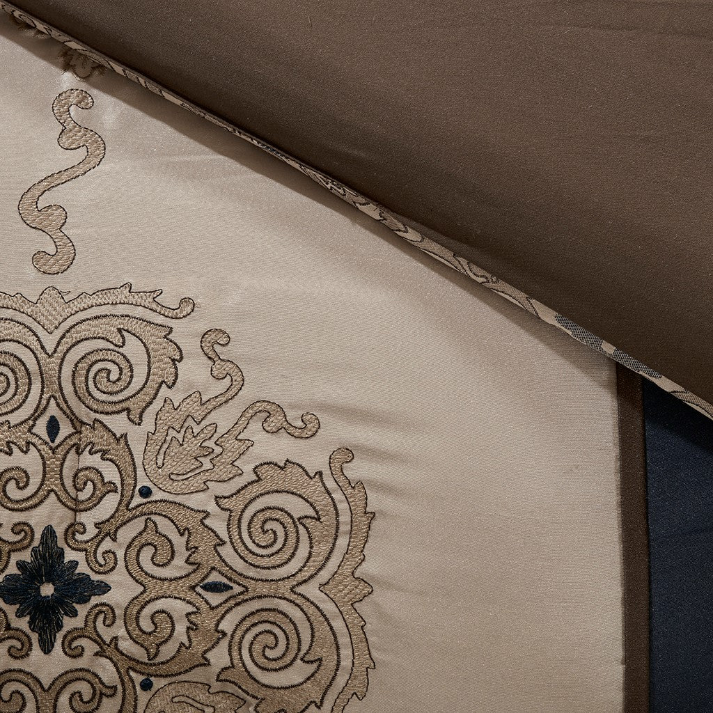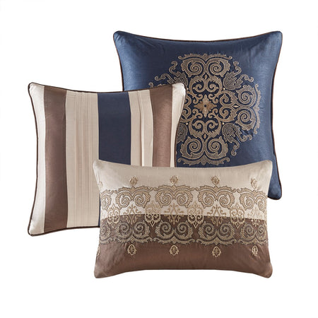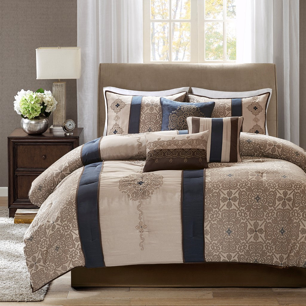 Classically stylish, the Madison Park Donovan 7 Piece Comforter Set turns your bedroom into a luxurious getaway. The jacquard woven comforter showcases an elegant color palette in navy, taupe, ivory, and brown accented three embroidered medallions. Matching shams coordinate beautifully with the top of the comforter, while a brown bed skirt provides extra charm to the bedspread. A solid brown reverse adds a bold and neutral touch to the comforter set. Three decorative pillows feature fabric manipulation and embroidered details to complement the design, completing the ensemble. Items in the set may come in a rolled or compressed packaging, which will need to be fluffed up or steam ironed before use to remove wrinkles.