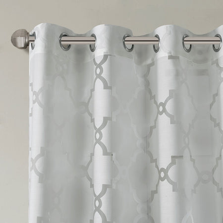 Stylish yet delicate, the Madison Park Eden Fretwork Sheer Curtain will update and soften any room. The lightweight sheer fabric features a burnout fretwork design on a grey ground, for a dimensional and airy look. Finished with a grommet top detail making it easier to hang, open, and close panels throughout the day. Fits up to 1.25"Â diameter rod.