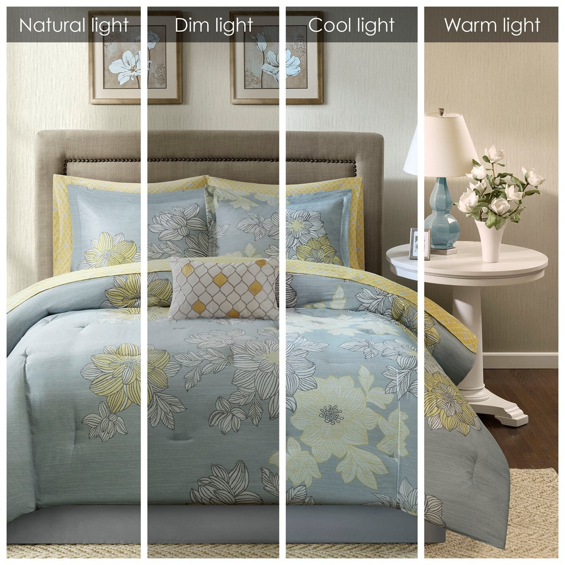 - Large scale printed floral design on one side for asymmetrical look on comforter set and printed cotton sheet set