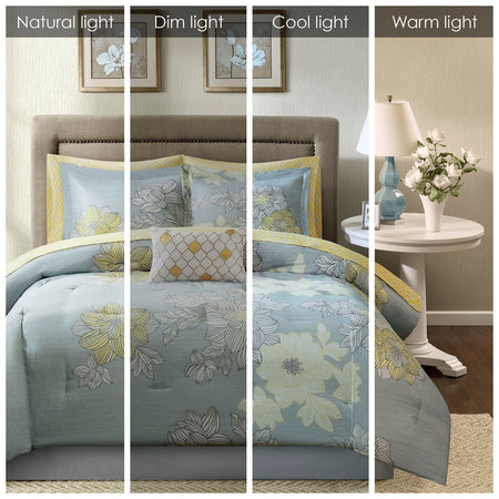 Add style to your bedroom with Madison Park Essentials Avalon 7/9 Piece Comforter Set with Cotton Sheet Set. This beautiful large scale floral pattern is printed off to one side on the comforter to create a contemporary, asymmetrical look. Coordinating shams (1 in Twin Sizes) pair perfectly with the coverlet while a decorative pillow with embroidered details adds dimension to the top of the bed. Also included is a 100% cotton sheet set that provides an alluring touch with its printed design. Bringing the best in health and wellness, this bedding set also features an anti-microbial treatment that provides built-in freshness protection, reducing the growth of odor causing bacteria and keeps fabric lasting longer. This bedding set may come in rolled or compressed packing and will need to be fluffed up. Use a steam iron to help remove wrinkles easier.