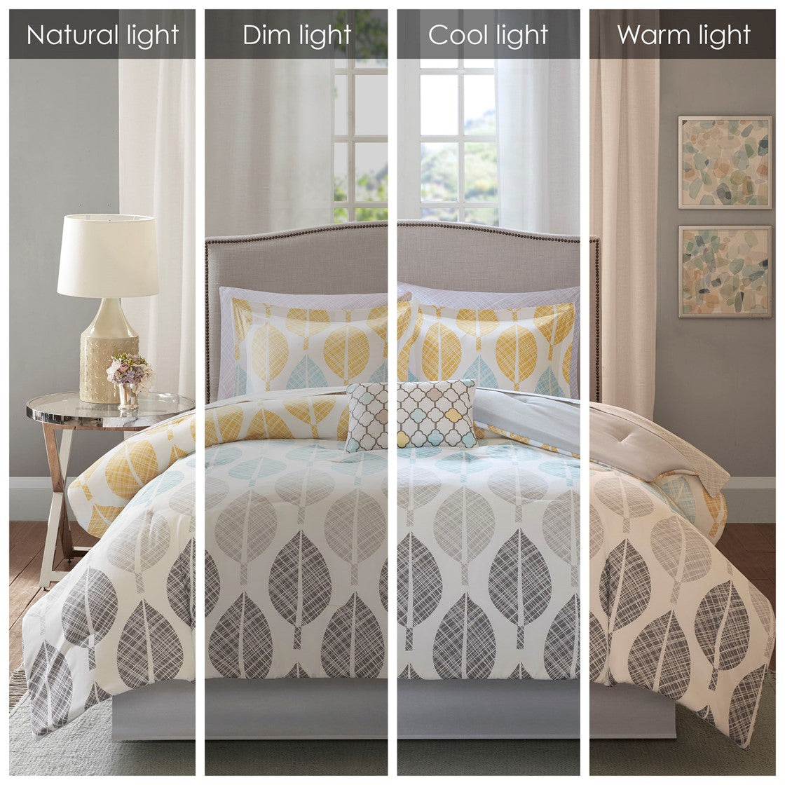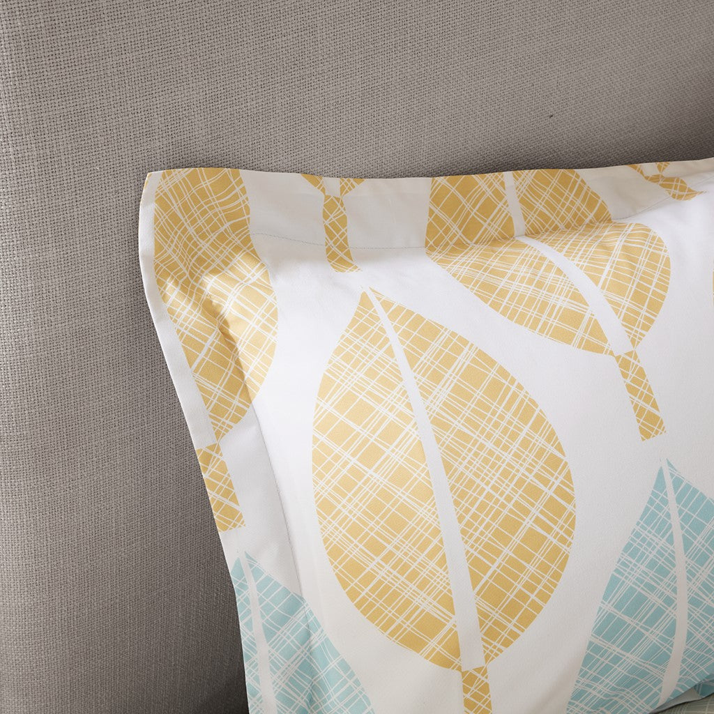 Create a relaxing vibe in your bedroom with the Madison Park Essentials Central Park Comforter Set with Cotton Sheet Set. This bedding set is OEKO-TEX certified, meaning it does not contain any harmful substances or chemicals, ensuring quality comfort and wellness. The comforter features a printed yellow and aqua leaf design in soft and pleasant colors against a white backdrop, for a charming botanical look. A solid grey reverse coordinates perfectly with the bed skirt and matching shams (1 for Twin Sizes) bring the floral motif to the head of the bed. Also included is a complete sheet set that harmonizes beautifully with the rest of the ensemble. An embroidered decorative pillow adds the finishing touch to the look. Bringing the best in health and wellness, this bedding set also features an anti-microbial treatment that provides built-in freshness protection, reducing the growth of odor causing bacteria and keeps fabric lasting longer. This bedding set may come in rolled or compressed packing and will need to be fluffed up. Use a steam iron to help remove wrinkles easier.