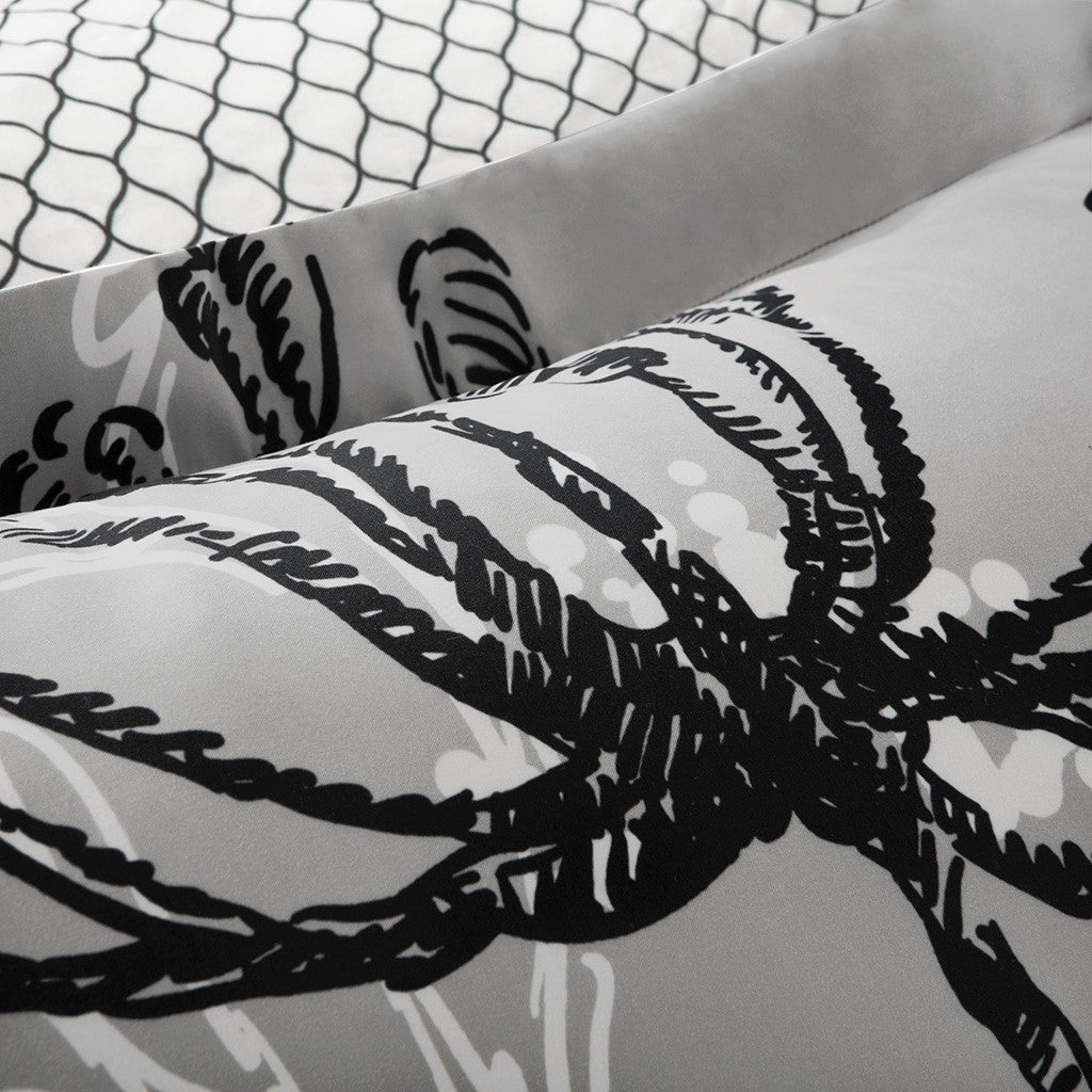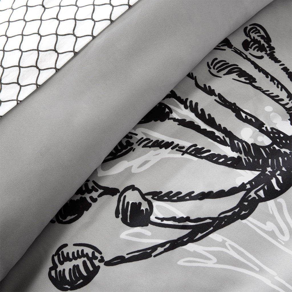 - Transitional large scale bright purple and black floral print on grey comforter set with 100% cotton printed sheets