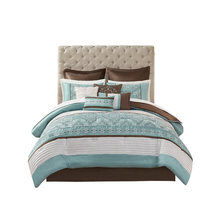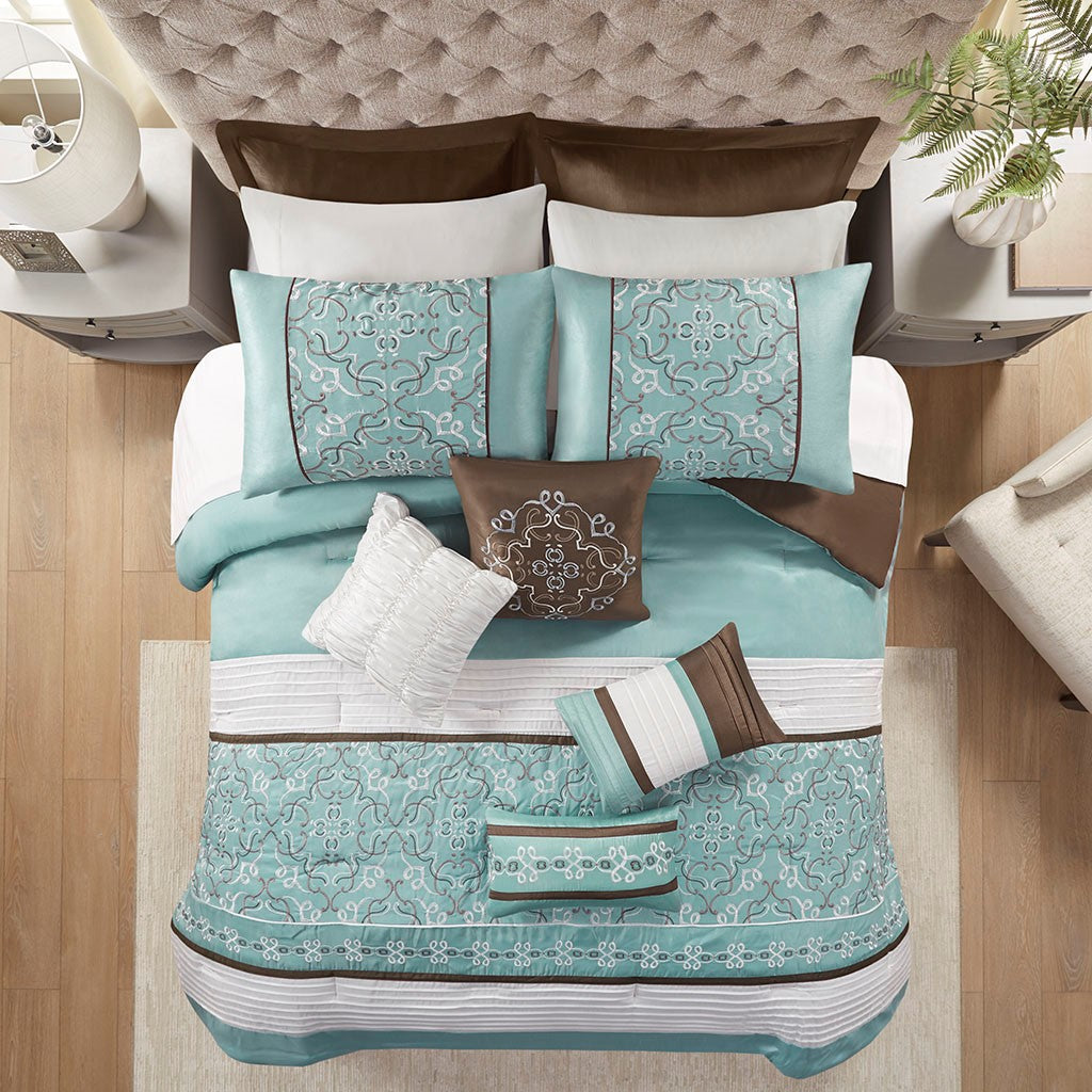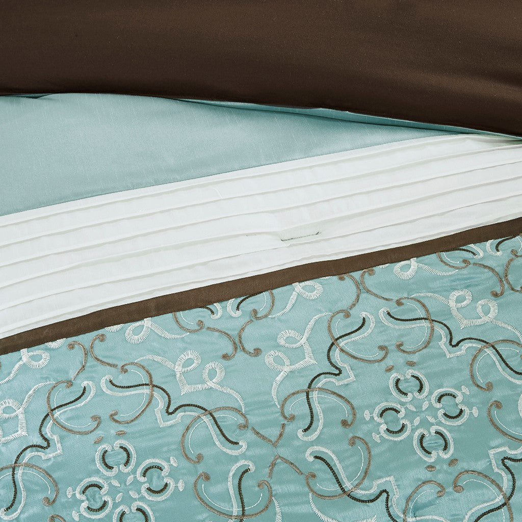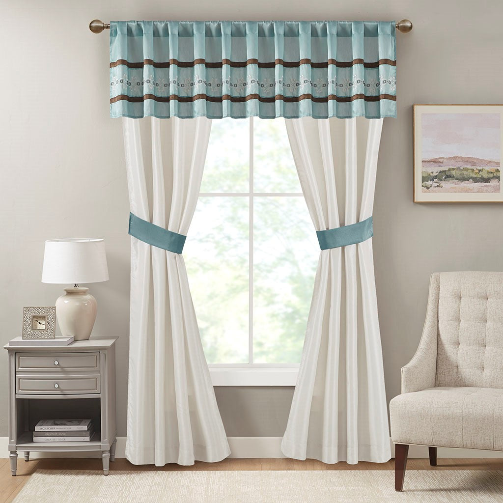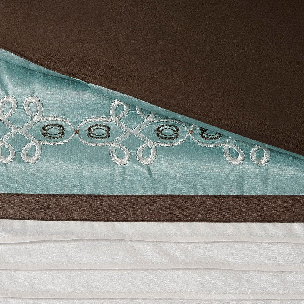 Update your entire space instantly with the Madison Park Essentials Jelena 24 Piece Room in a Bag. The solid blue base on this comforter works beautifully with the soft white and chocolate brown piecing. Decorative embroidery adorns the bottom portion of this comforter and the center of each sham creating a rich look in your space. Four solid white window panels, four blue tie backs and two embroidered valances accompany your new bedding for a whole room makeover. Four embroidered decorative pillows, two euro shams and a bedskirt put the finishing touches on this complete look. This bedding set may come in rolled or compressed packing and will need to be fluffed up. Use a steam iron to help remove wrinkles easier.